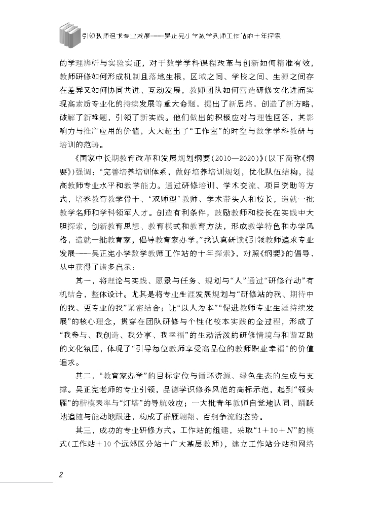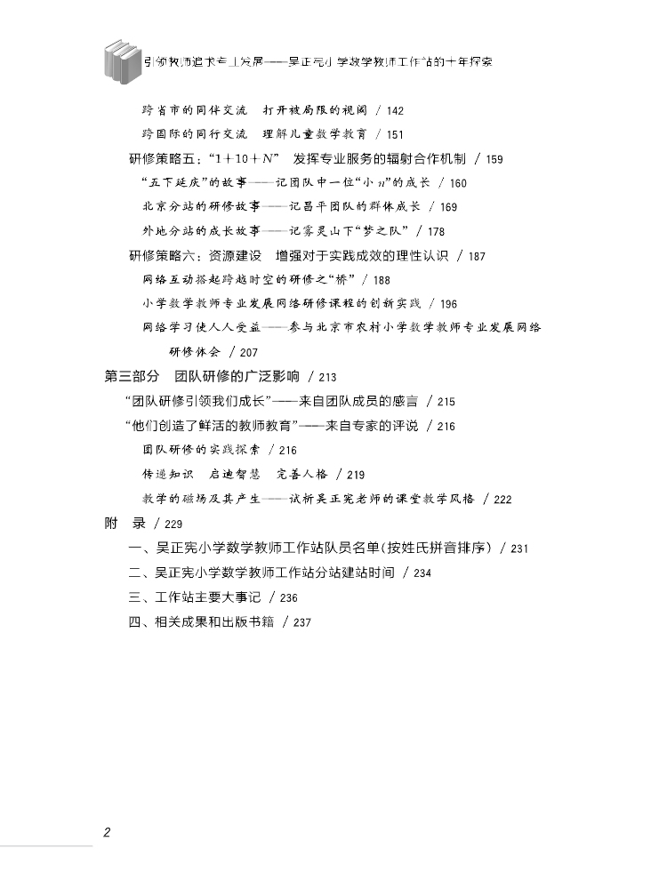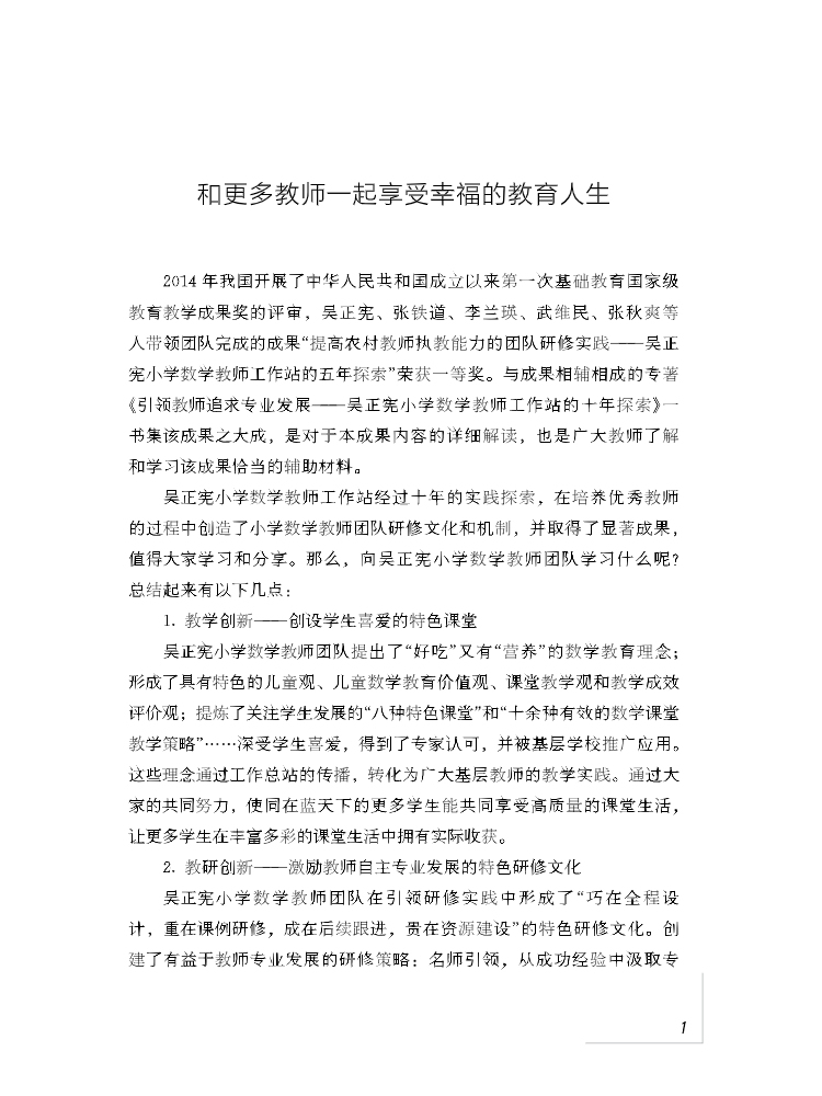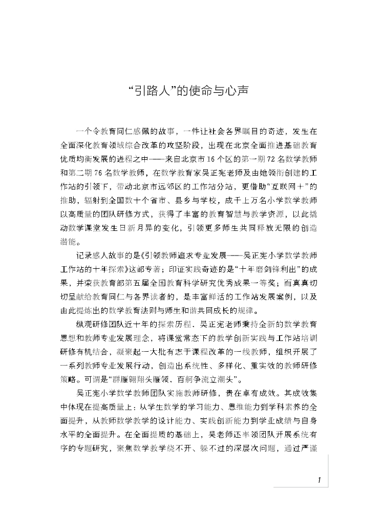 本书是2014年国家级教学成果奖获奖作品。该书主要介绍了作者吴正宪秉持全新的数学教育思想和教师专业发展理念,将课堂常态下的教学创新实践与工作坊培训研修有机结合,凝聚起一大批有志于课改的一线教师,组织开展了一系列教师专业发展行动,创造出系统性、多样化、重实效的学科研修策略。为我们多维度地呈现出在教育变革的大背景下孕育而出的“吴正宪教育现象”,为教师合作互动、学科合作交流、学校合作共享、城乡教育均衡发展开拓出新途径,也为教育现代化背景下的教师专业发展探索了新路。
