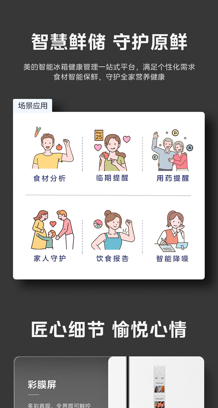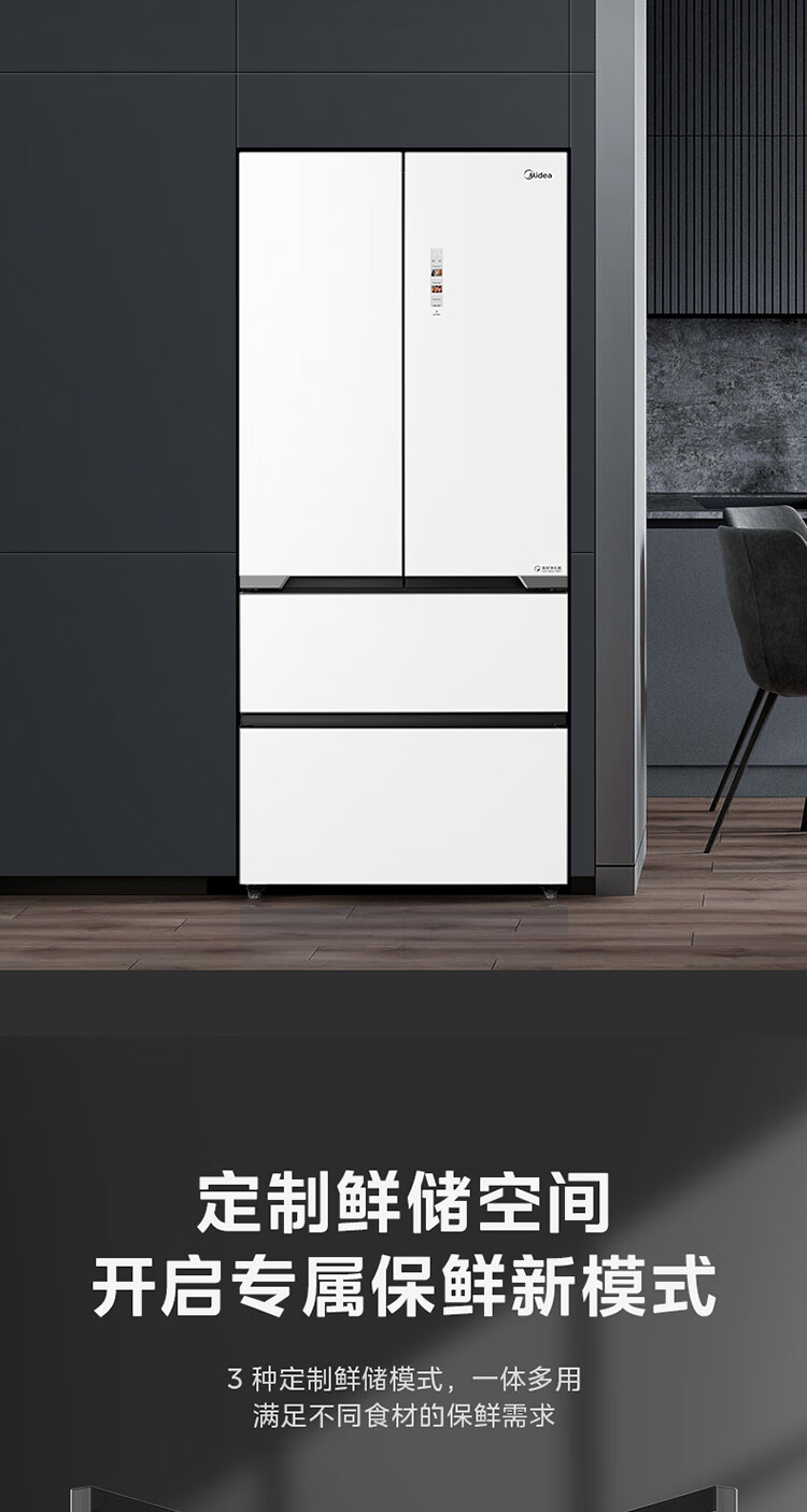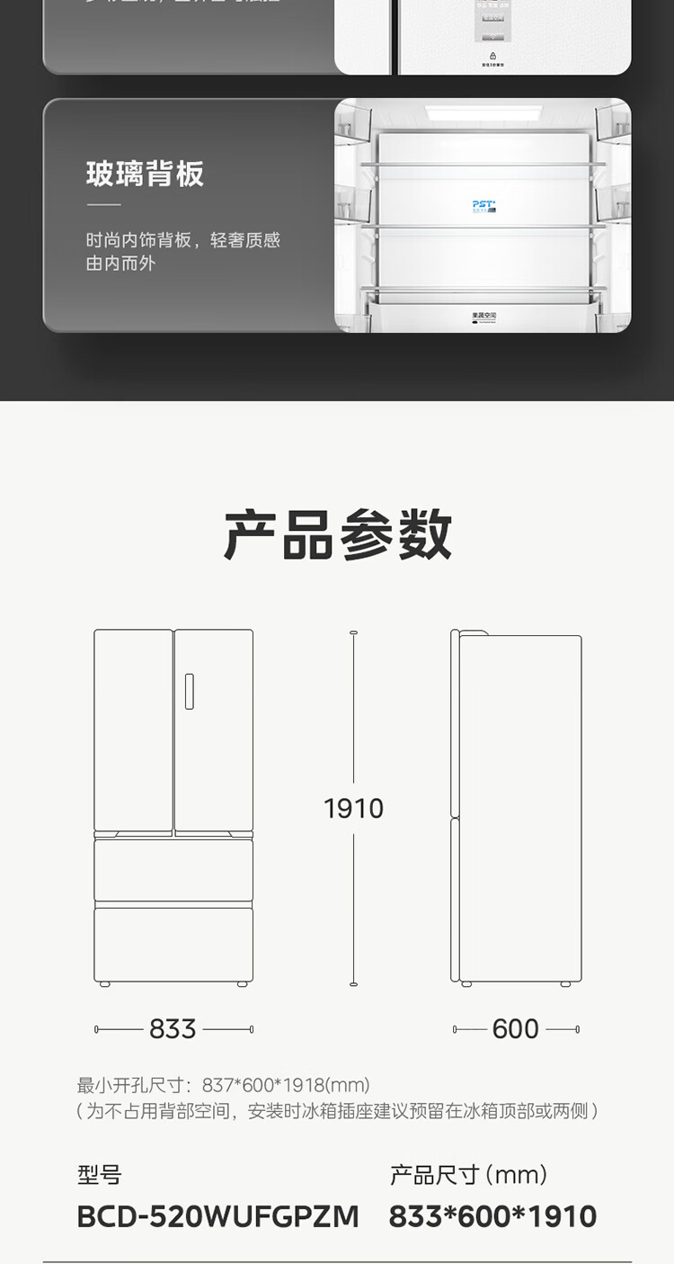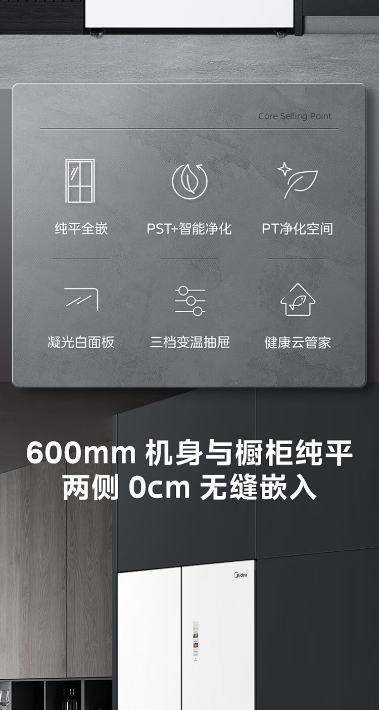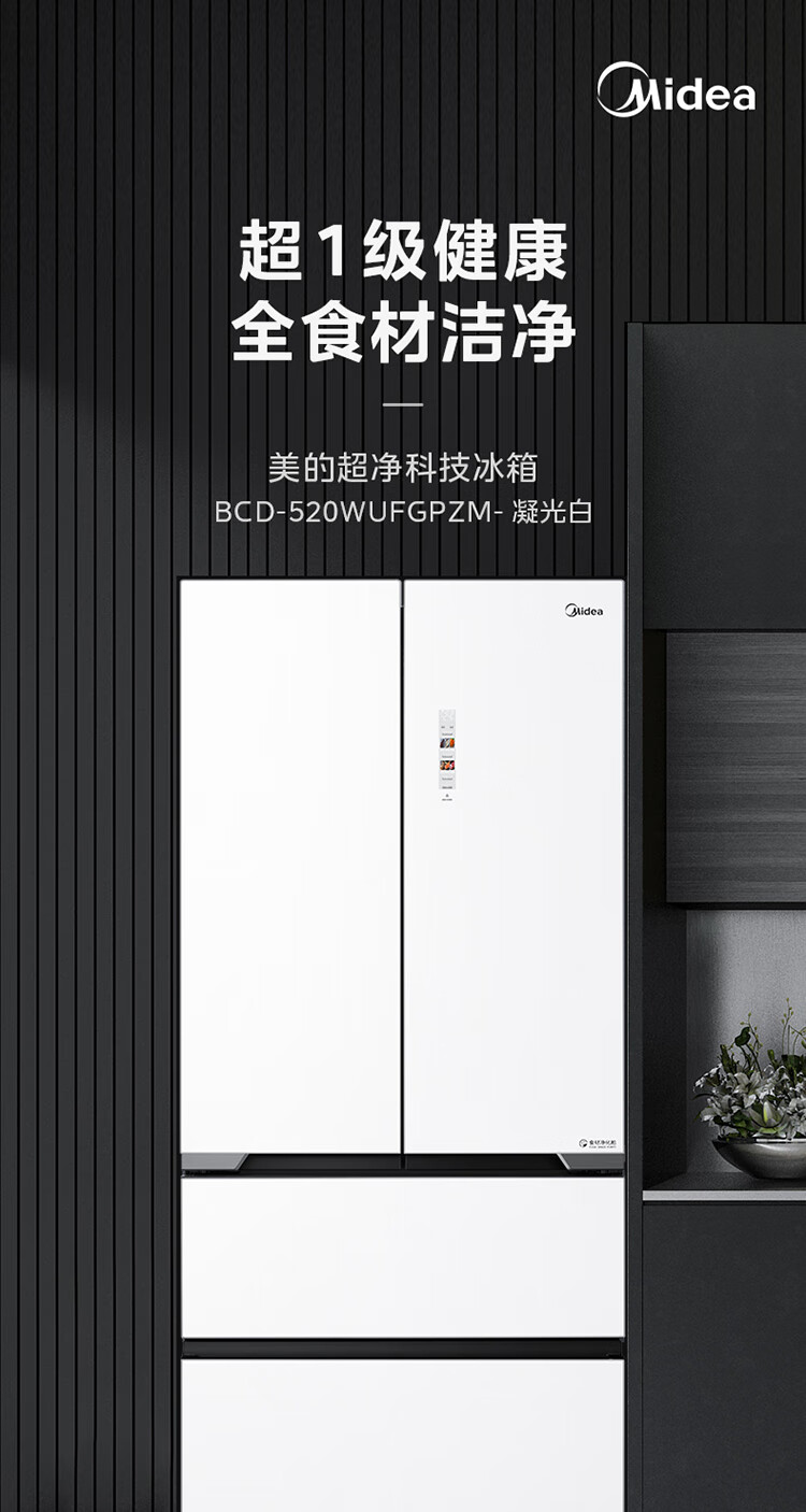 美的(Midea)冰箱520升法式四门60cm薄纯平全嵌超净科技除菌保鲜智能家用大冰箱BCD-520WUFGPZM凝光白