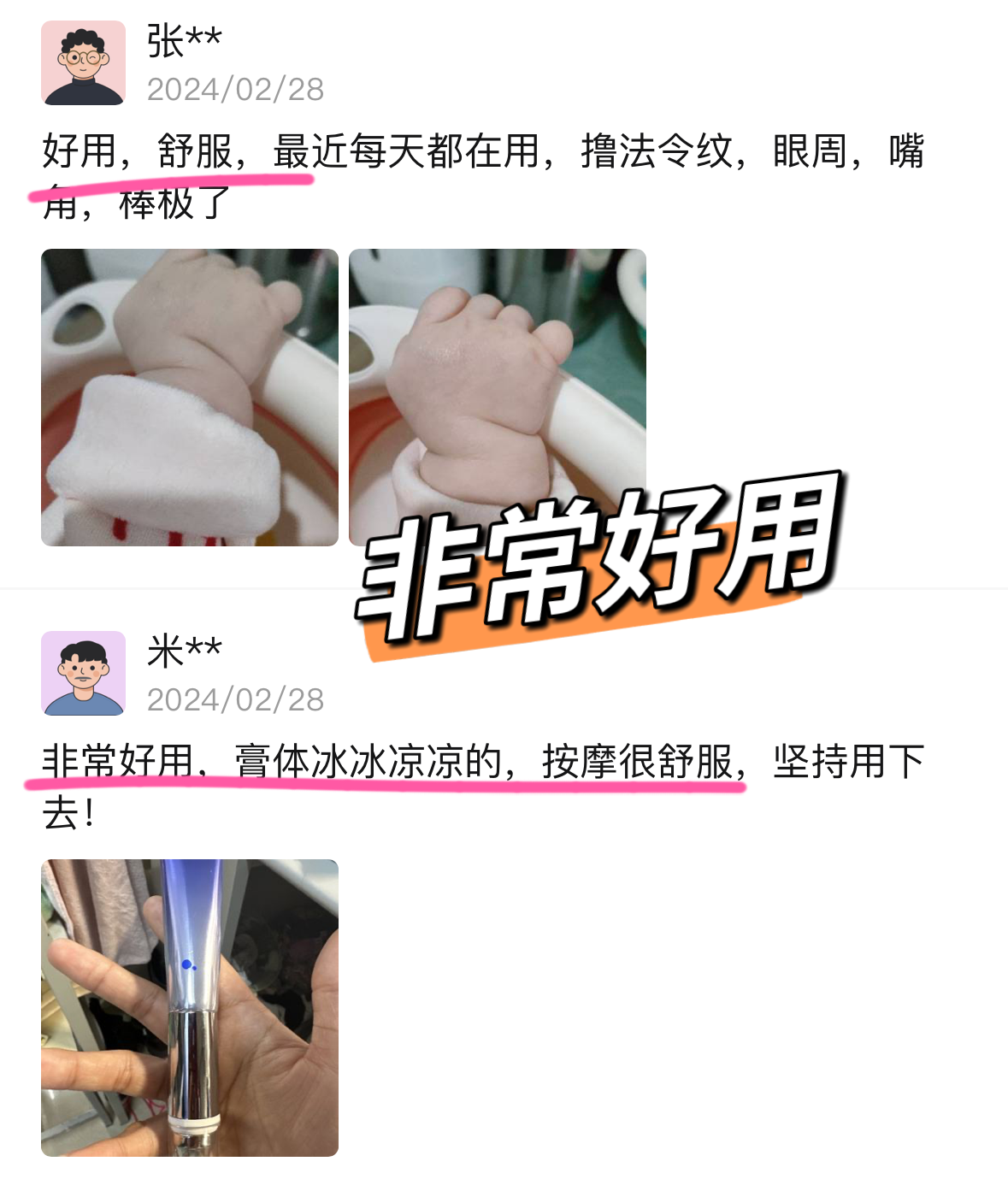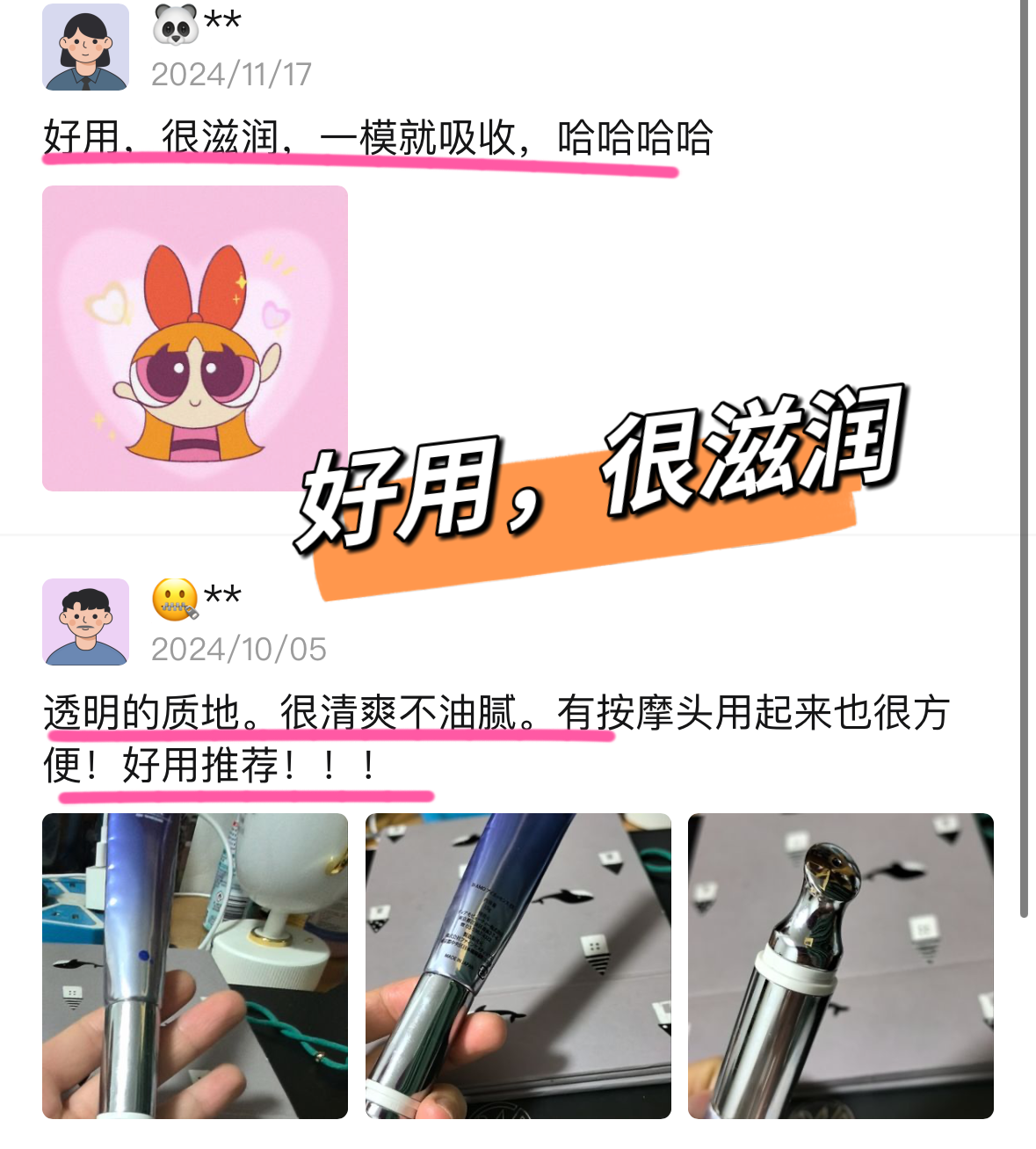 首先眼霜啫喱质地,在接触皮肤的瞬间化成水状,涂抹在肌肤上清凉得像手碰到了溪水,肤感特别舒服清透力肉眼可见呢,再加上有按摩头帮助加倍吸收,不会营养过剩,完全不会给眼部造成负担,不分年龄,20岁到60岁都可以用。