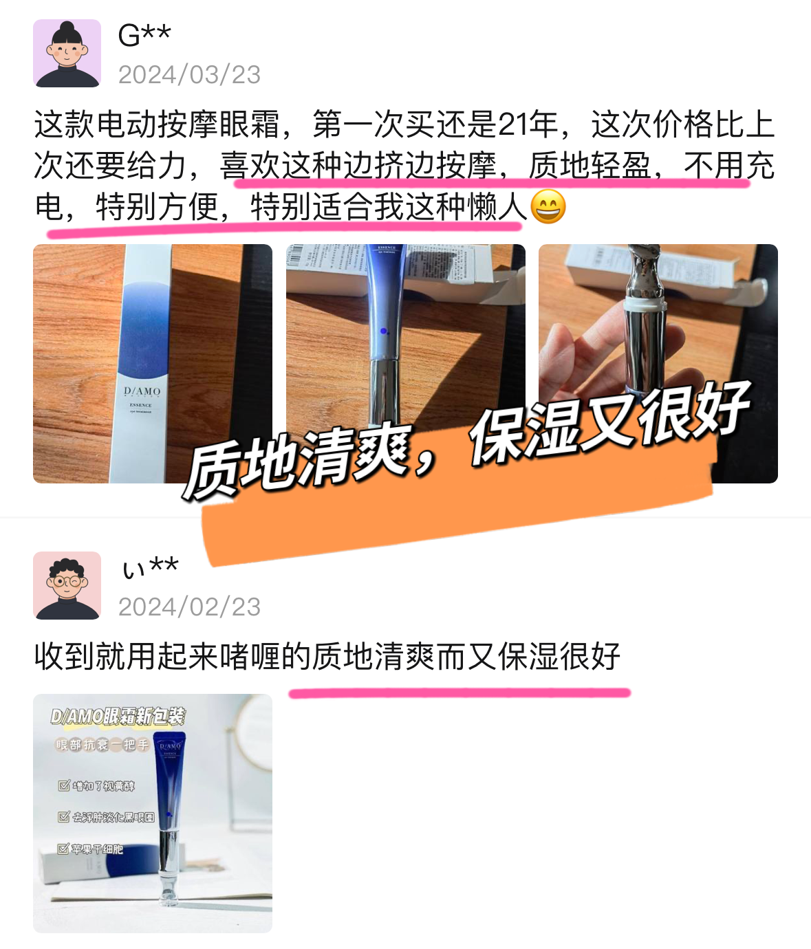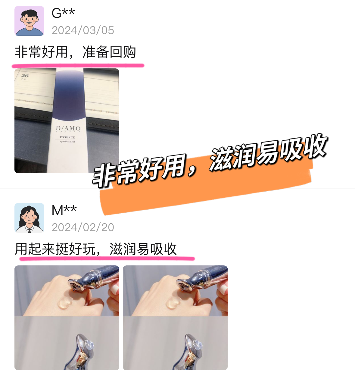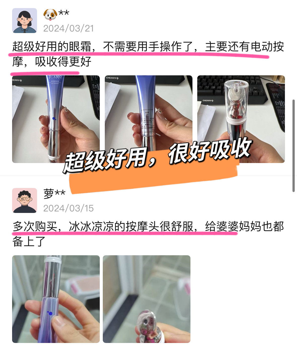 还获得日本美容医疗大赏的Top1,出身不输任何一款大牌眼霜,在日本银座购买需要排队是常有的事。对比优势:鼎鼎大名的赫莲娜小绿瓶眼霜,采用的就是锌合金材质的导头,同样的材质,比它还优秀的是,DAMO这款眼霜还会震动。