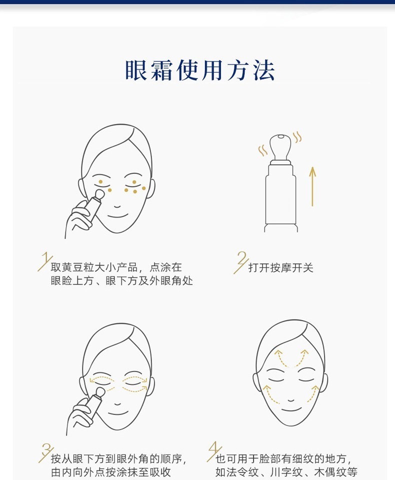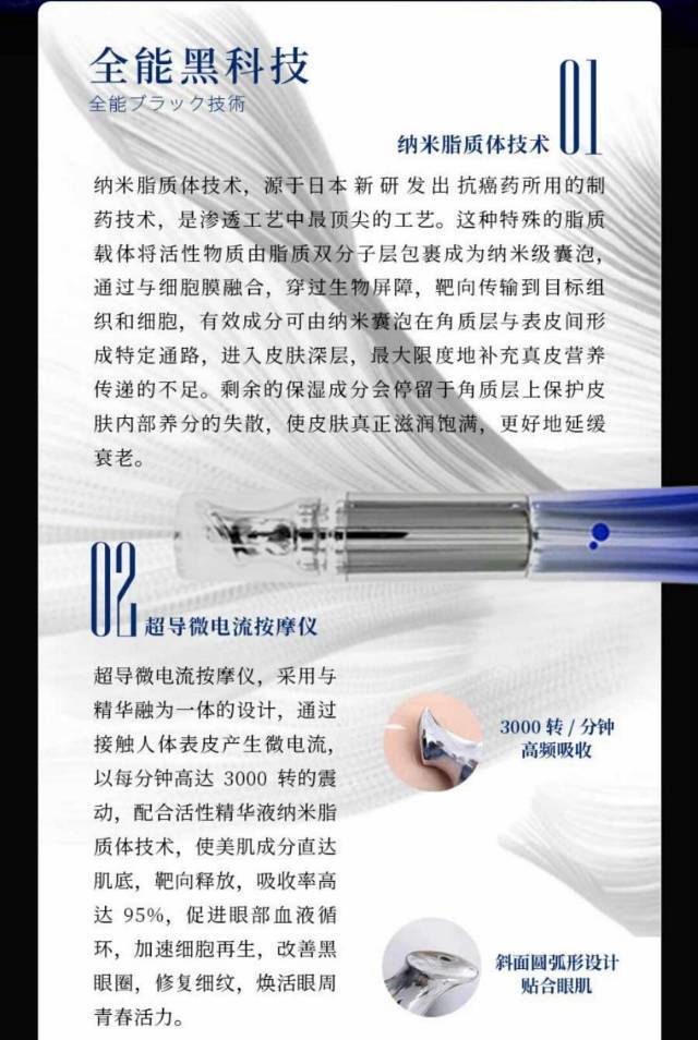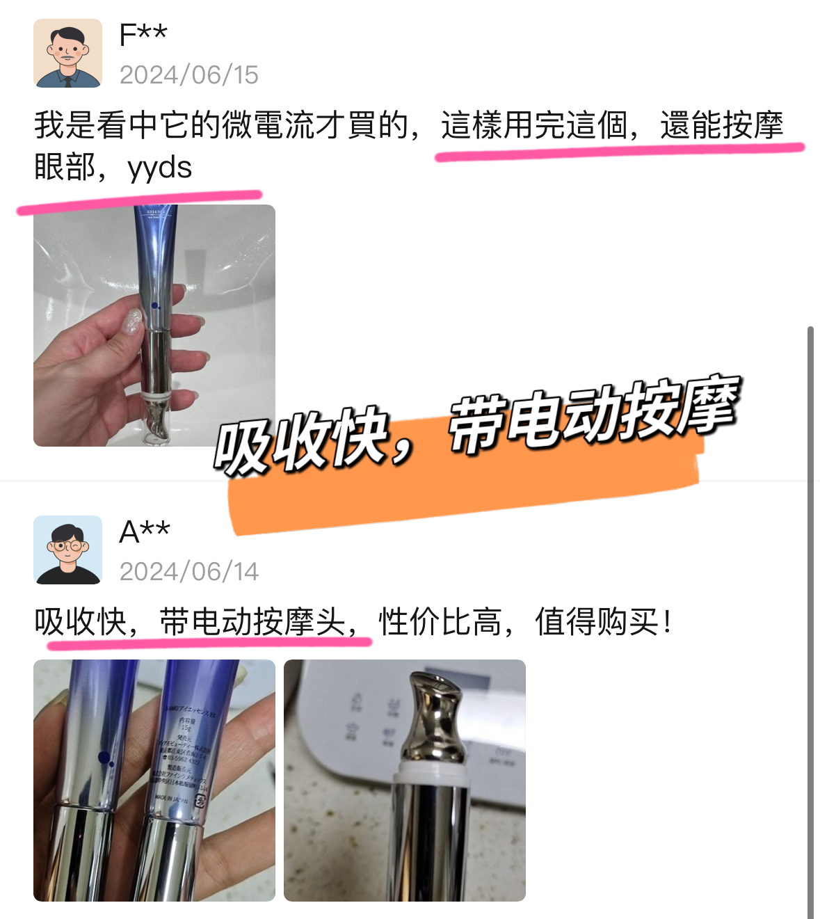 上有按摩头帮助加倍吸收,不会营养过剩,完全不会给眼部造成负担,不分年龄,20岁到60岁都可以用。