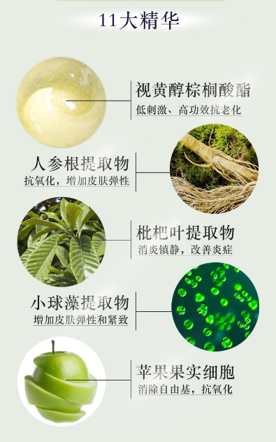2:还含有水解性蛋白、水解蚕丝、水解胶原,维持肌肤紧致,促进胶原蛋白合成,延缓衰老,提拉紧致,填平皱纹。
