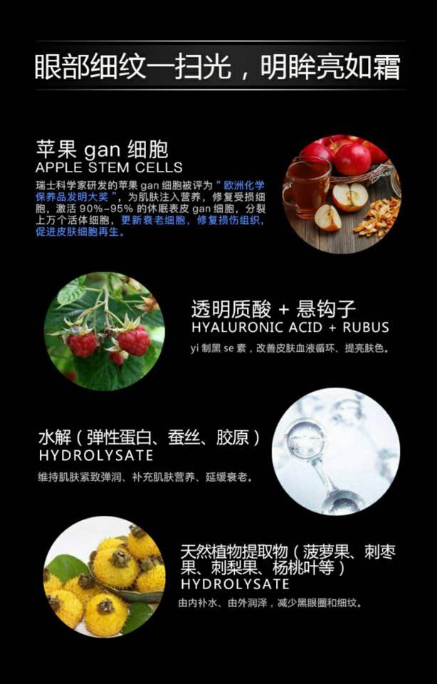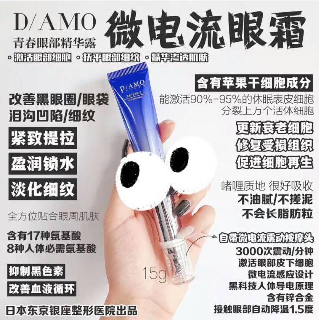 DAMO这款眼霜不仅采用了黑科技技术,眼霜精华更是鼎鼎的厉害,核心成分是得过瑞士大奖的苹果干细胞,有着强大的修复受损和再生细胞能力,瑞士科学家研发的苹果干细胞被评为“欧洲化学保养品发明大奖”同时浓度相比一代提升10倍!!