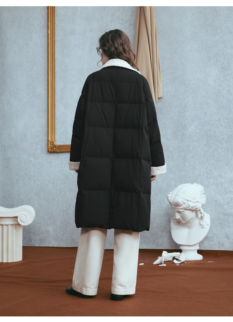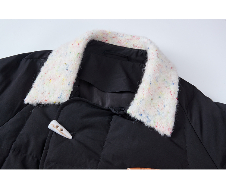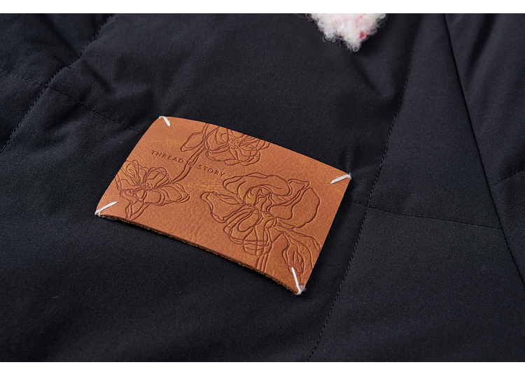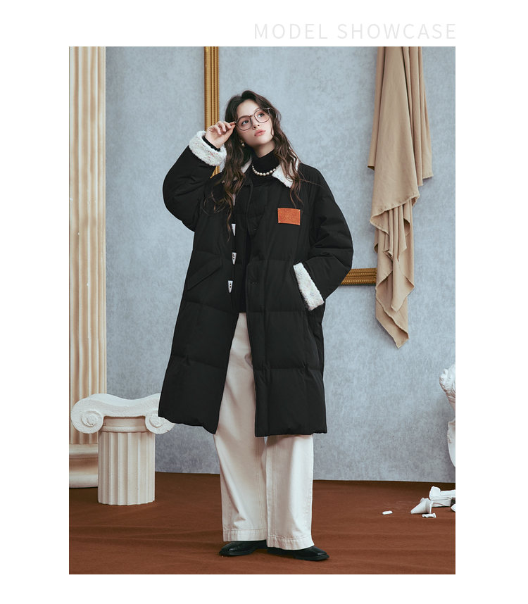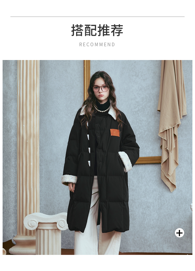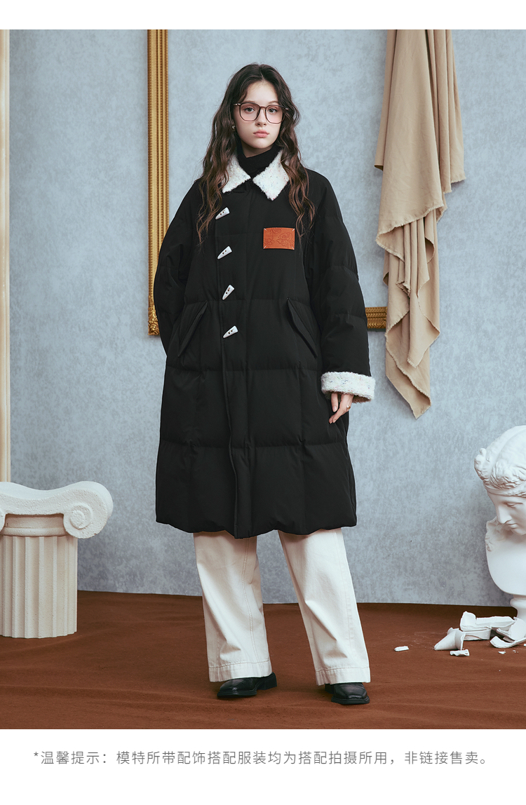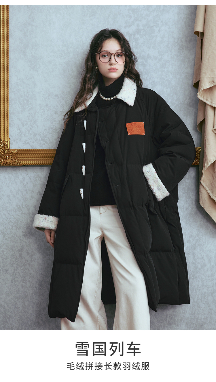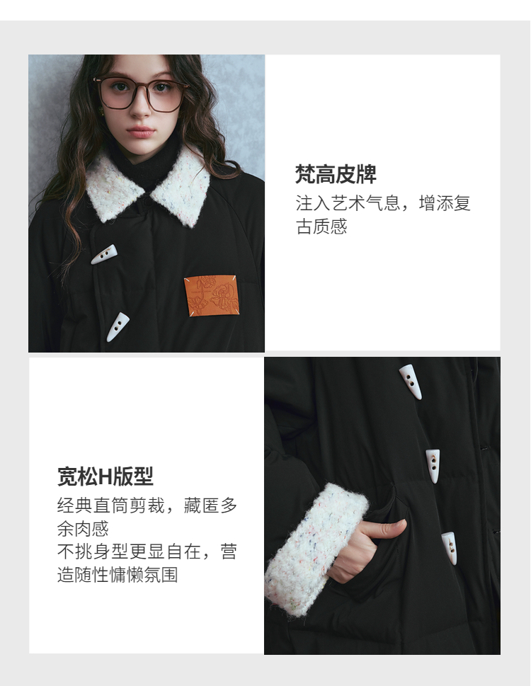 【暖冬内购】两三事梵高文艺雪国列车2025冬新款简约皮牌装饰毛绒翻领羽绒服女