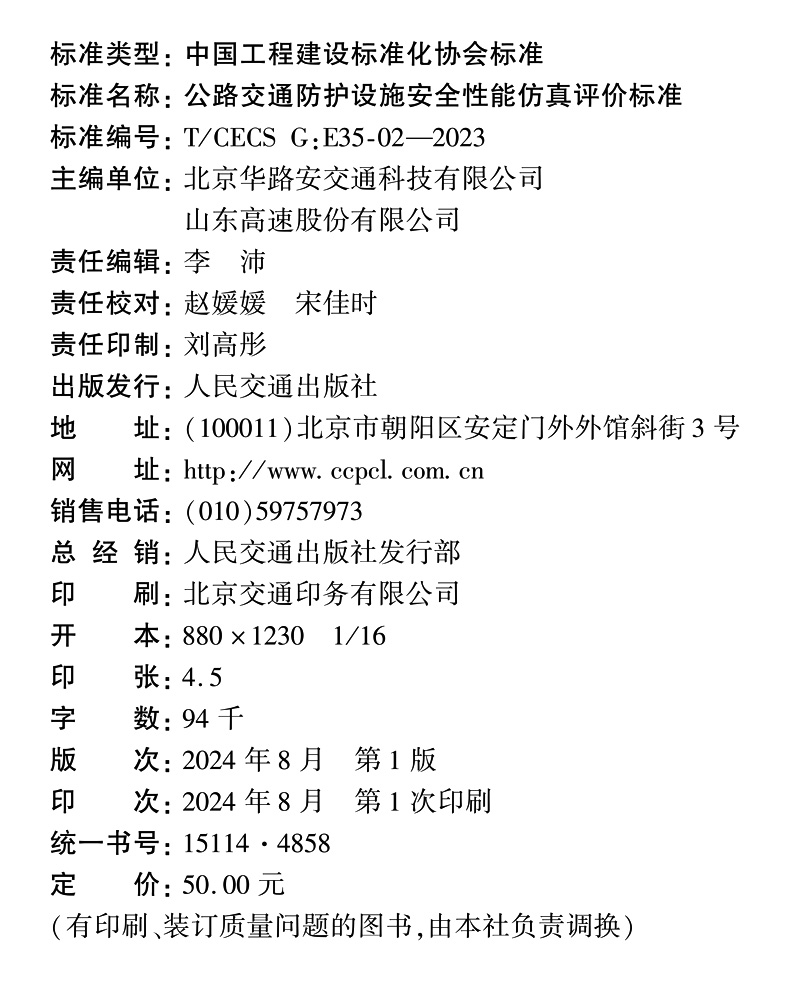 书名:公路交通防护设施安全性能仿真评价标准(T/CECS G:E35-02—2023)