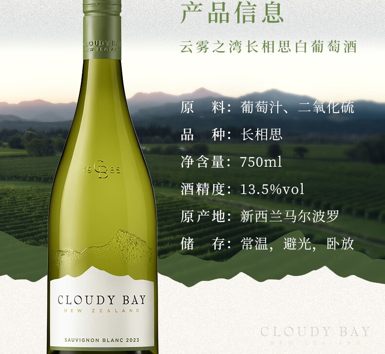 云雾之湾 Cloudy Bay 长相思干白葡萄酒 750ml 新西兰进口