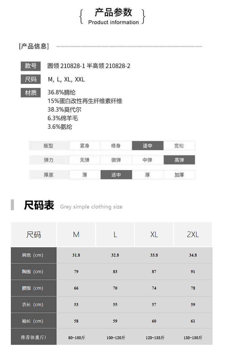 卖点:凝萃羊绒蛋白精华的动物纤维毛根细长、光泽好、细密轻暖 ;素有“纤维皇后”之称,再结合我们澳洲进口超细羊毛纱线、和美雅碧发热纤维、兰精莫代尔再生纤维组成了我们这款富含17种氨基酸、防螨抗菌、抗静电、抗起球、吸湿发热、吸湿排汗、免烫、除臭等等很多功能于一身的黑科技打底衫~ 执行标准(如GB或FZ开头):FZ/T73005-2021 安全类别(A/B/C):GB/T18401-2010B类 发货sku编码(货号):210828圆领,210828半高领 品名:多色羊毛美雅碧蛋白精华打底衫 规格:件 颜色:正黑色 纳米白 茶棕色 黑灰色 焦糖色 尺码:M(建议80-100斤),L(建议100-120斤),XL(建议120-135斤),XXL(建议135-150斤) 材质:36.8%腈纶 15%蛋白改性再生纤维素纤维 38.3%莫代尔 6.3%绵羊毛 3.6%氨纶 包装方式:盒装 快递:三通 韵达随机 发货地:浙江大仓 运费模板:港澳台,新疆,西藏不发货 发货时效:48小时 售后标准:线头,轻微色差,不在质量售后范围内。污渍,破损,开线,属于质量问题,自签收日起24小时之内带快递面单与产品同框拍照报售后,超时不予处理望谅解。 质量售后退回请发普通快递 不接收顺丰和京东物流件。质量售后报销运费时麻烦提供下付款截图,退回运费最高补偿8元。 |
