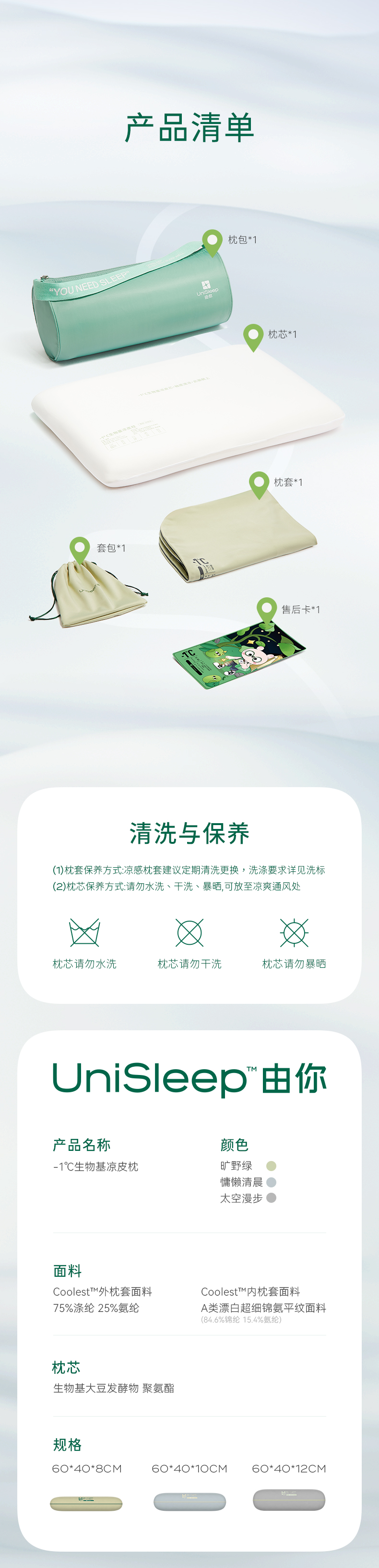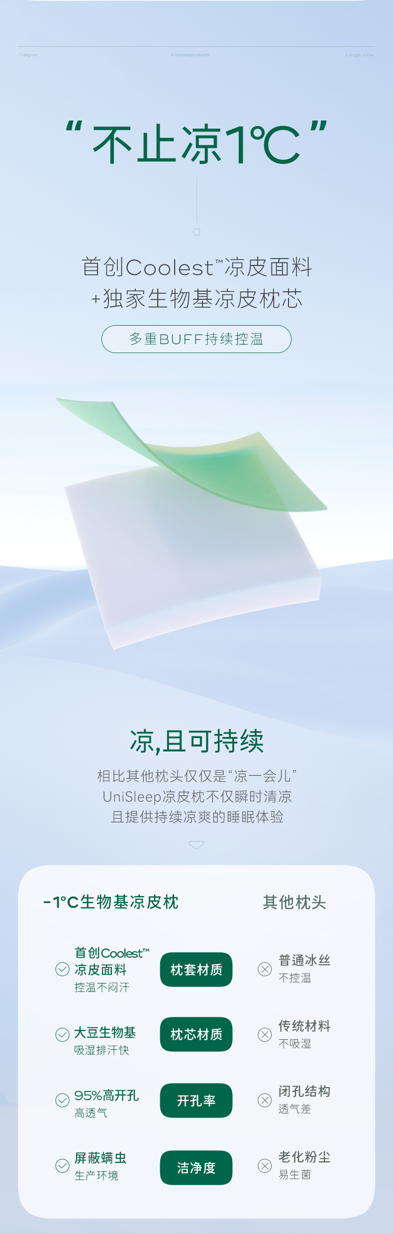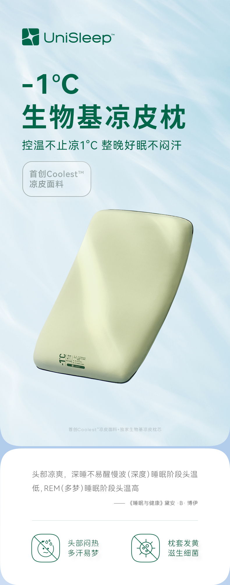 【包邮】UniSleep生物基凉皮枕透气防汗恒温助眠睡眠枕头防头油