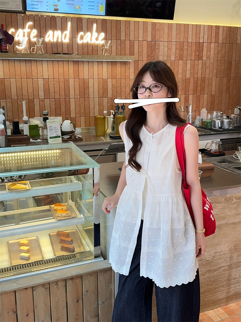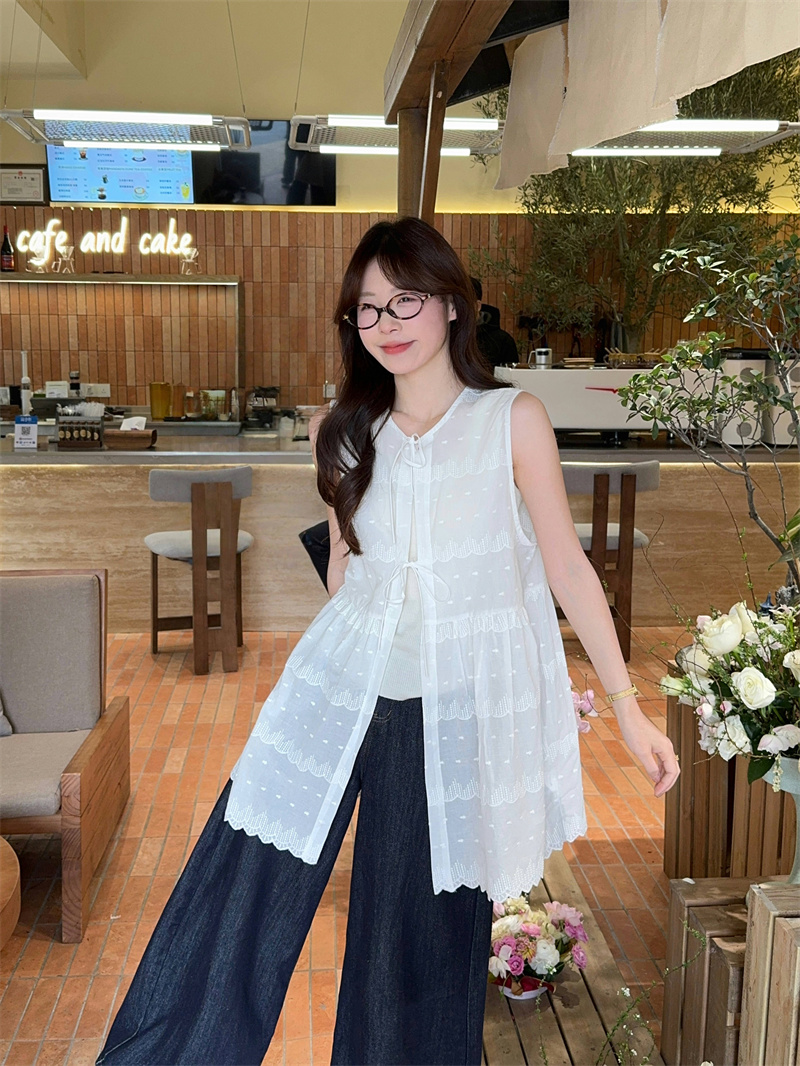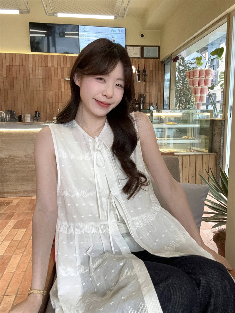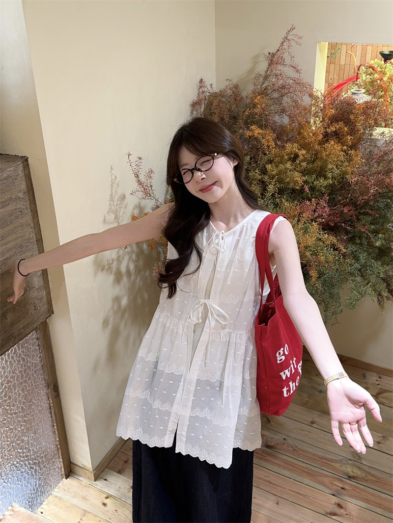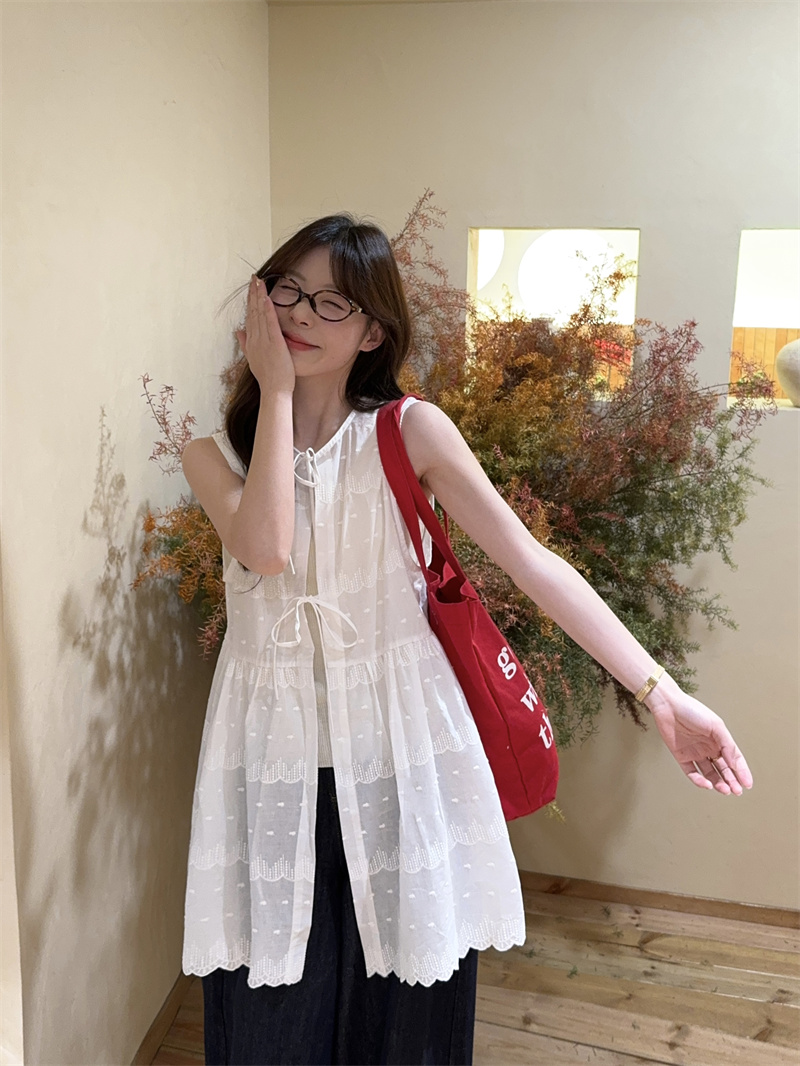 西遇无袖叠穿罩衫女春夏新款法式外搭白色开衫蕾丝边衬衫SS150314