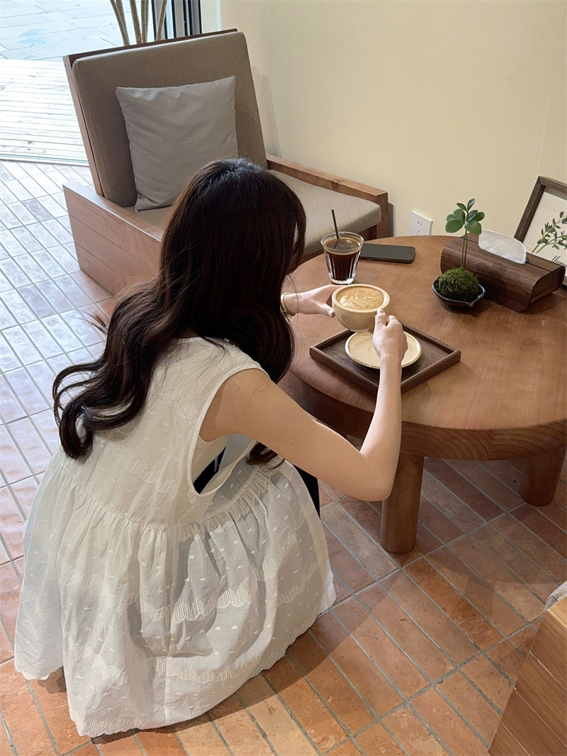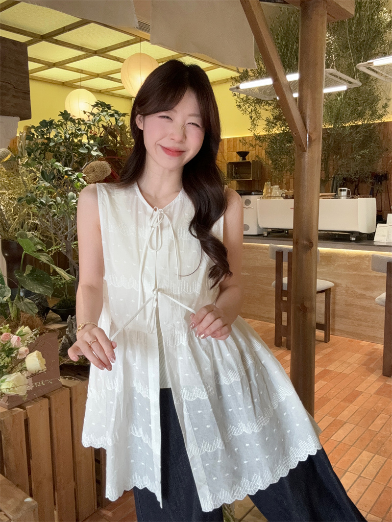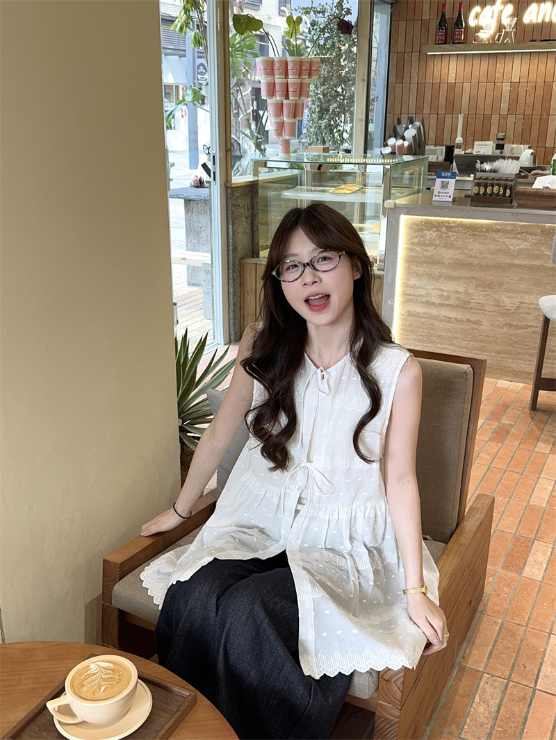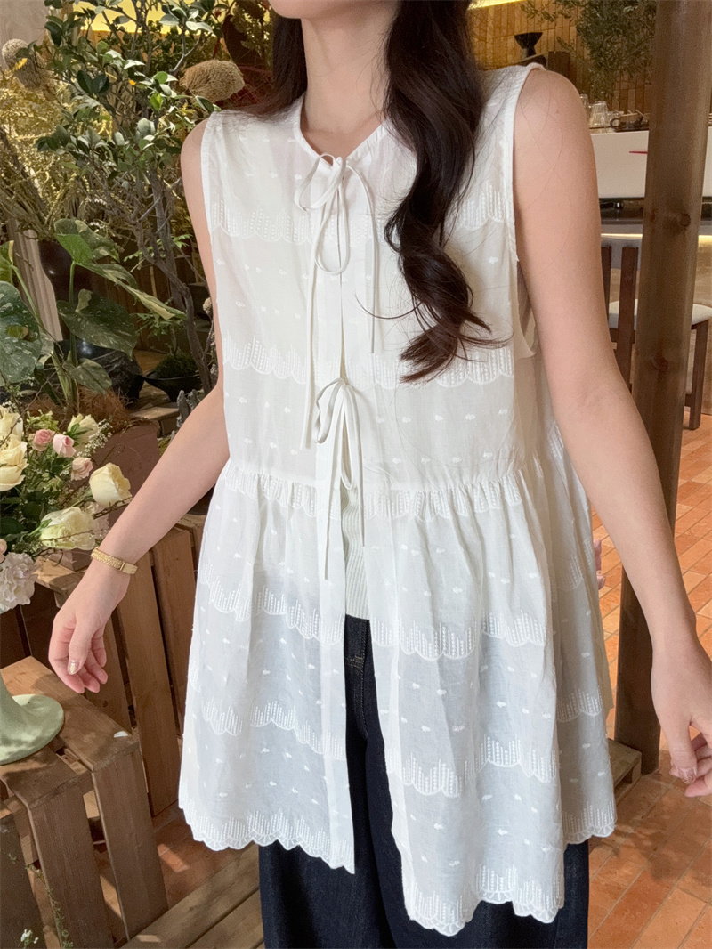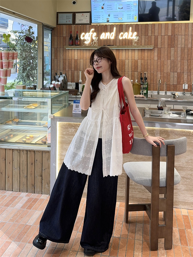 西遇无袖叠穿罩衫女春夏新款法式外搭白色开衫蕾丝边衬衫SS150314