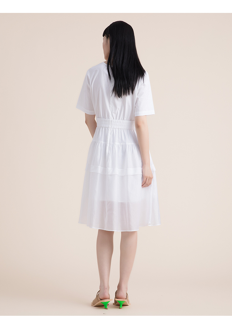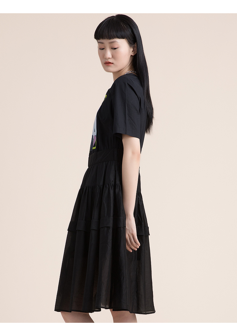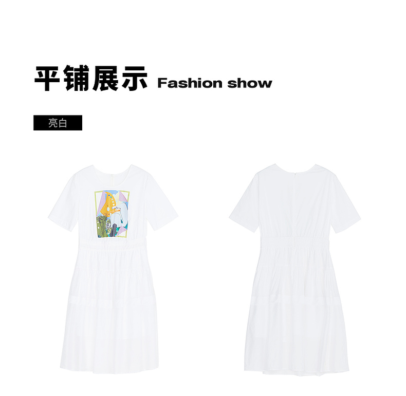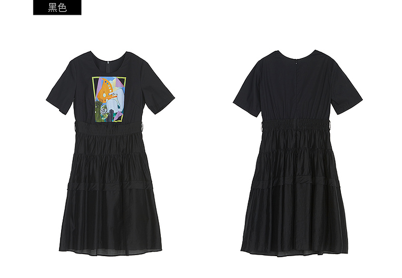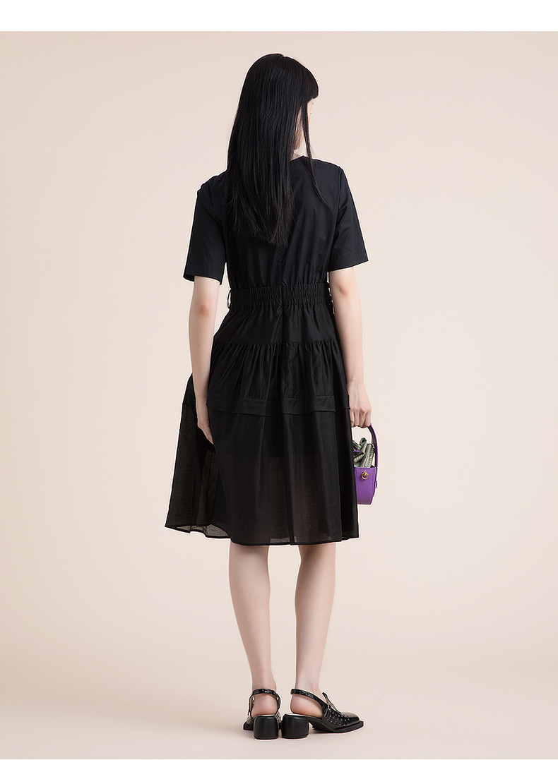 谜底2022夏季新款时髦通勤舒适拼接收腰圆领短袖连衣裙222ML0617