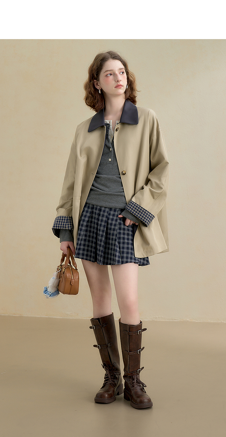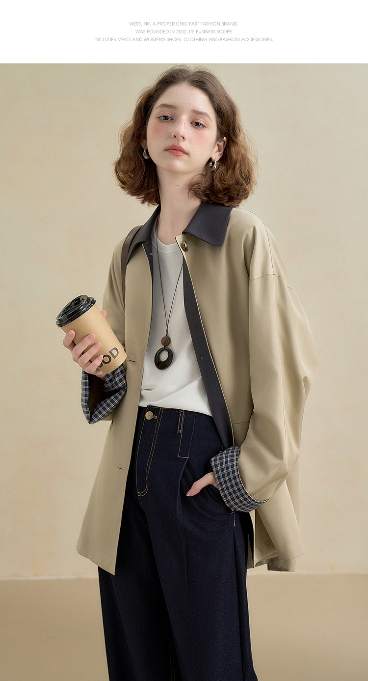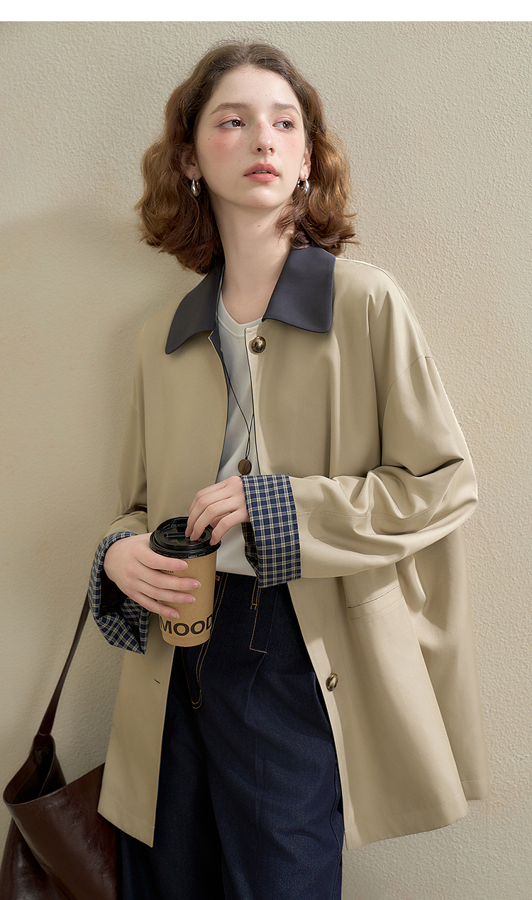 西遇英伦复古撞色格纹拼接风衣外套女秋季宽松显瘦中长款大衣V2951178