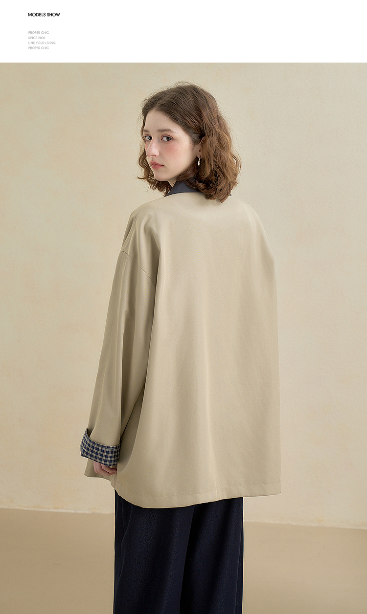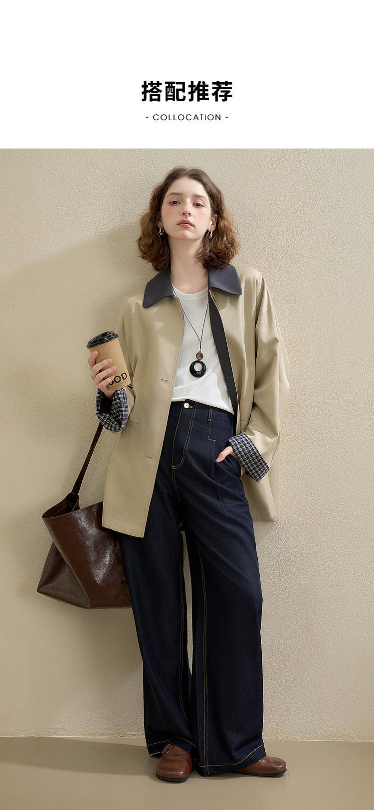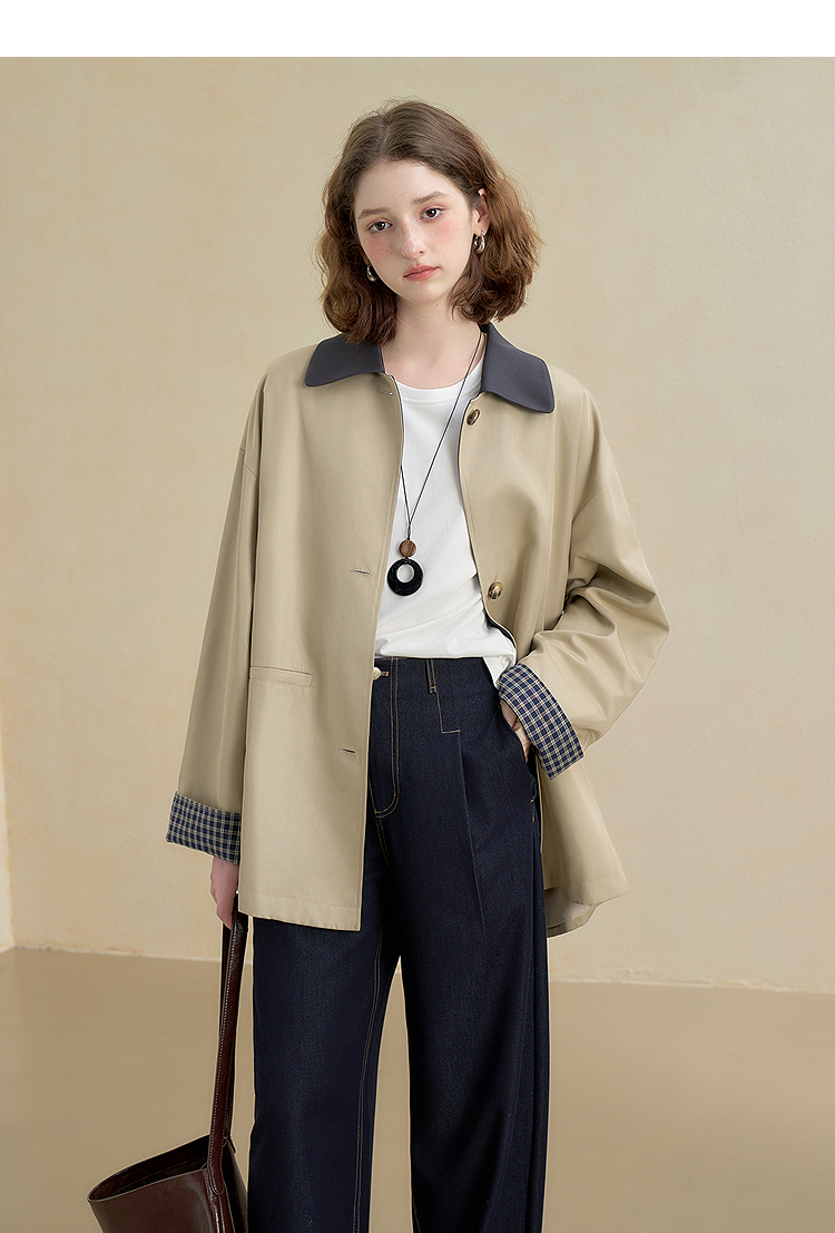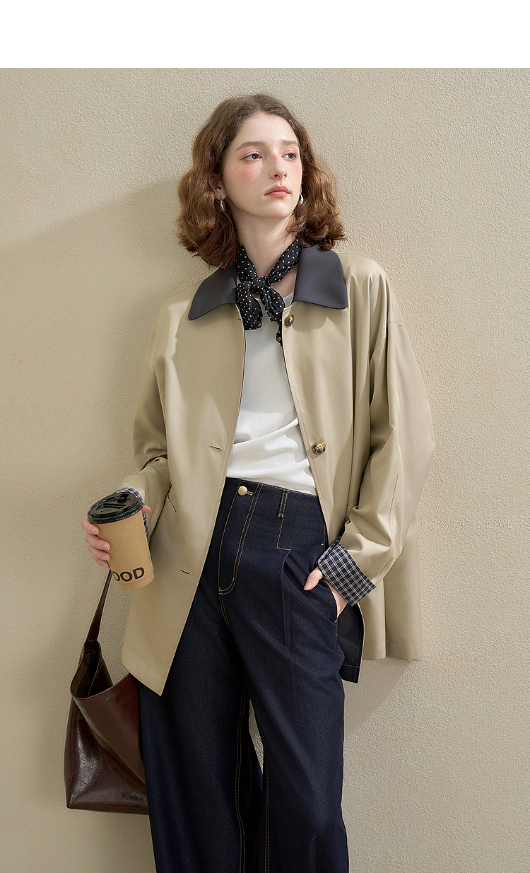 西遇英伦复古撞色格纹拼接风衣外套女秋季宽松显瘦中长款大衣V2951178