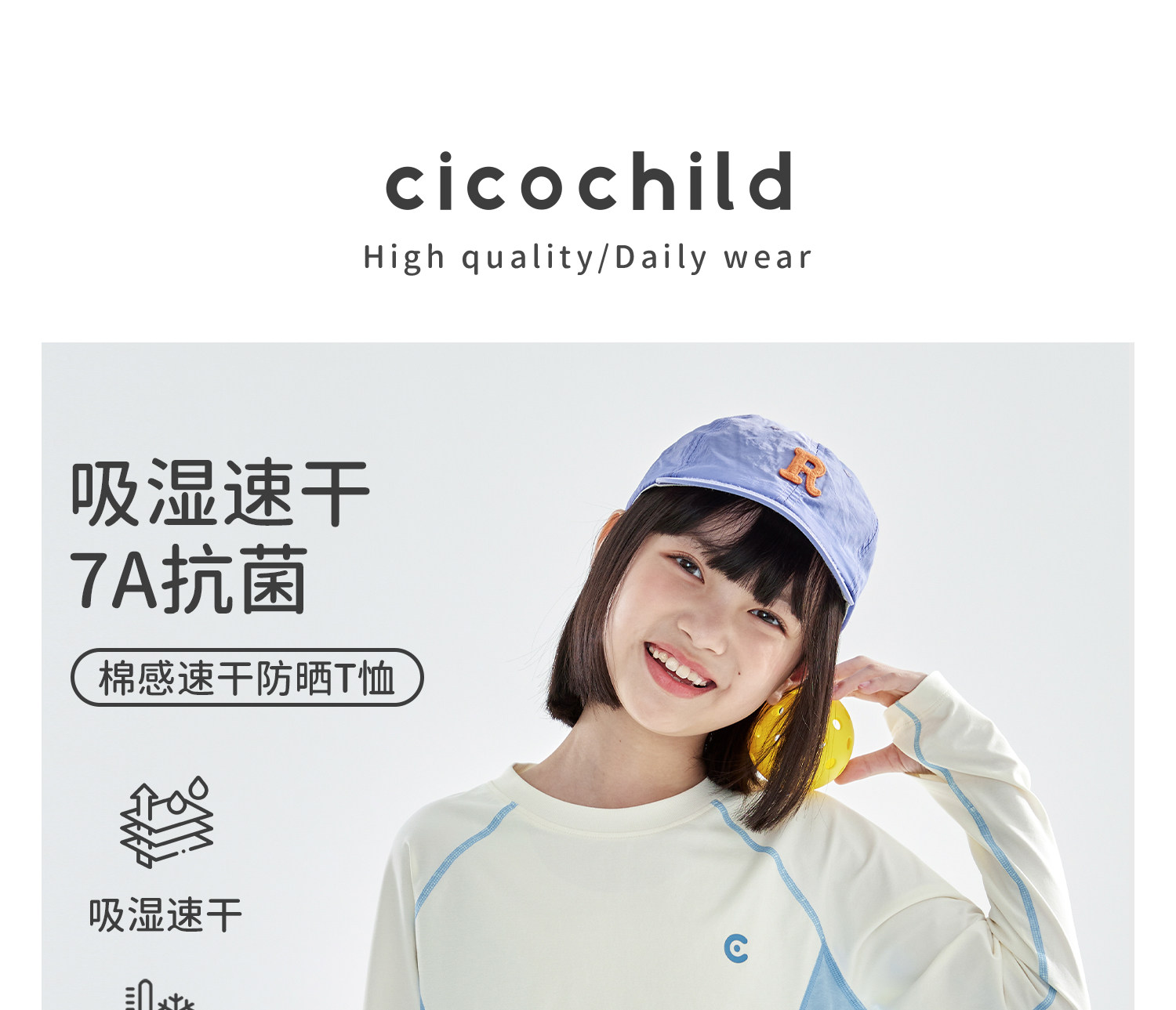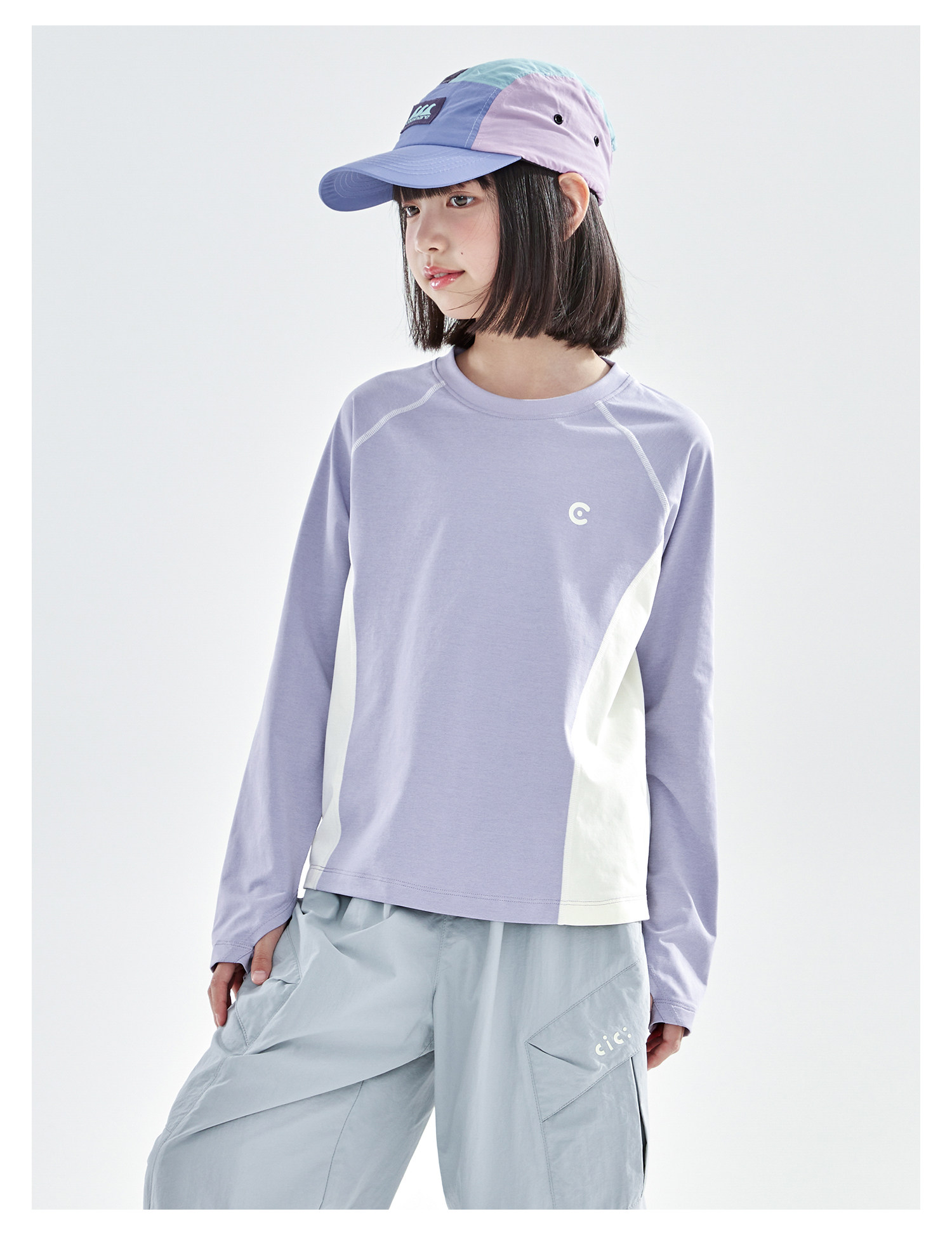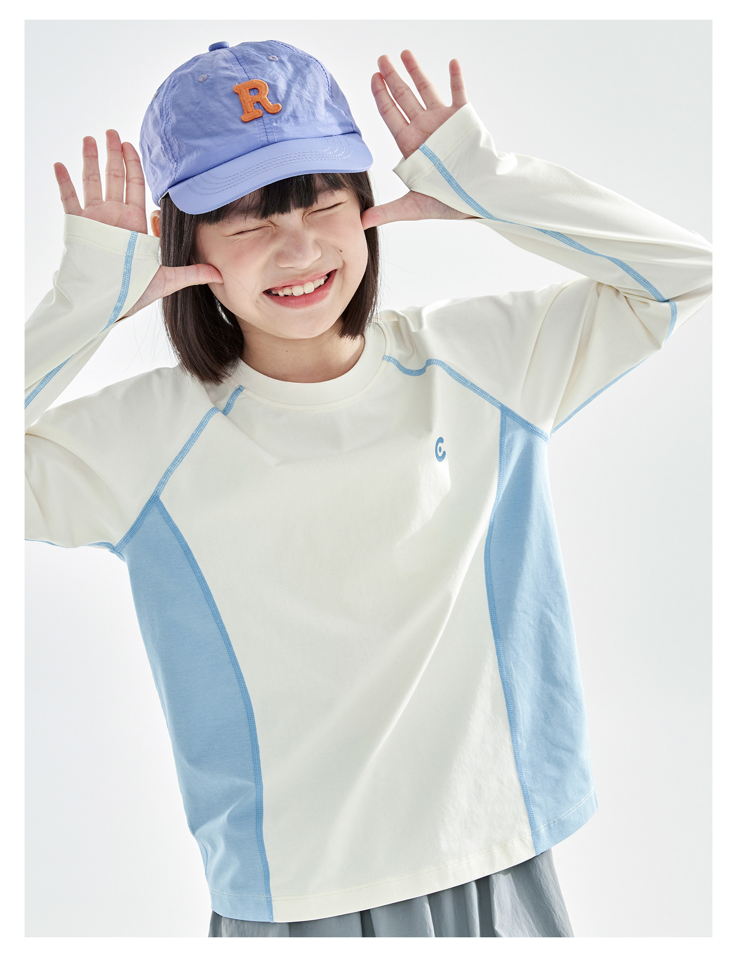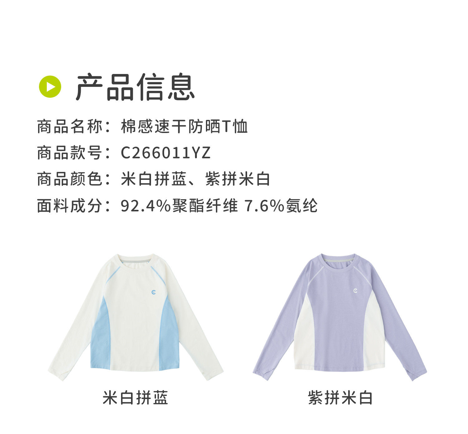 米白拼蓝预售4.7发 cicochild2026年春季新款女童棉感速干防晒T恤凉感7A抗菌拼色上衣