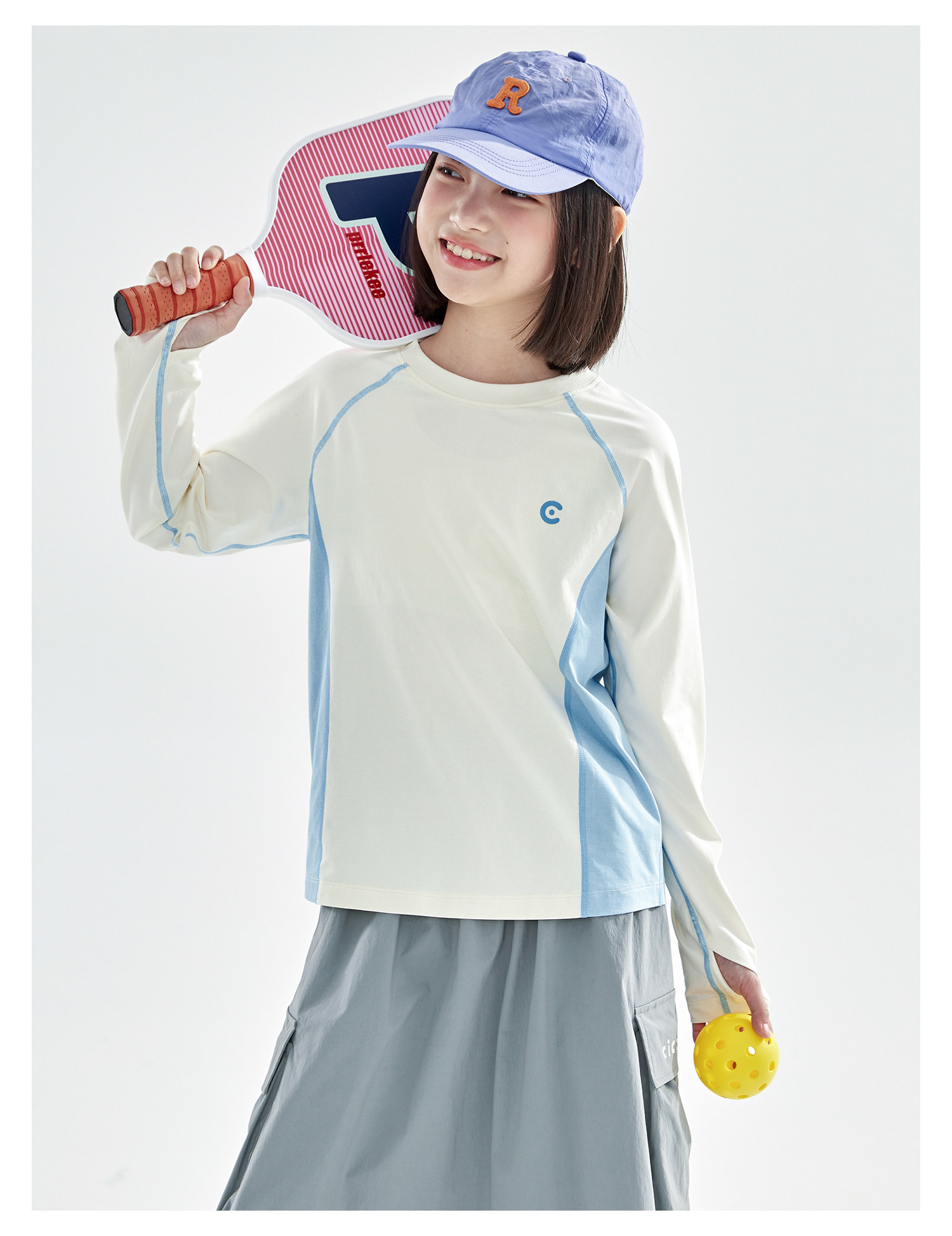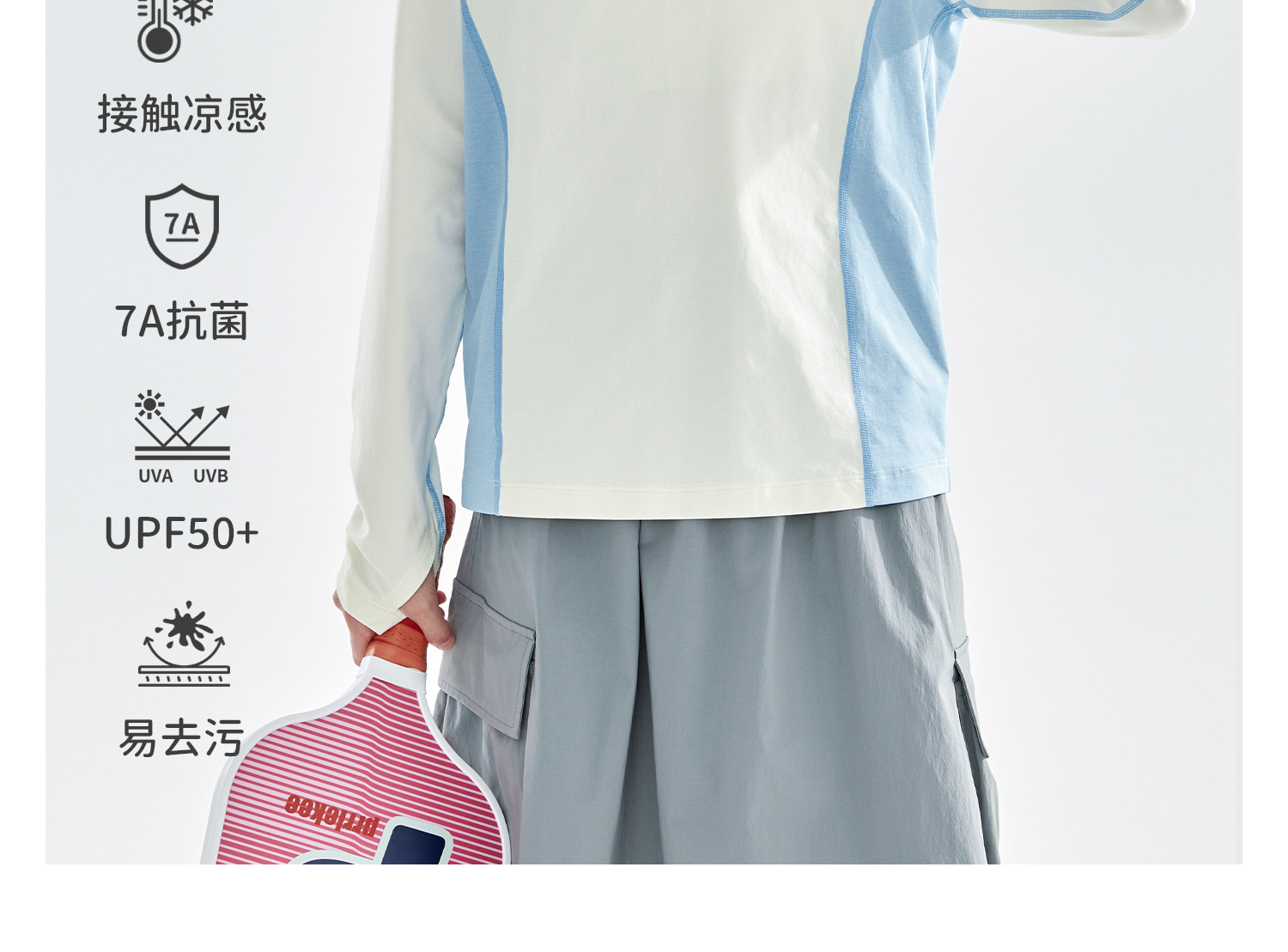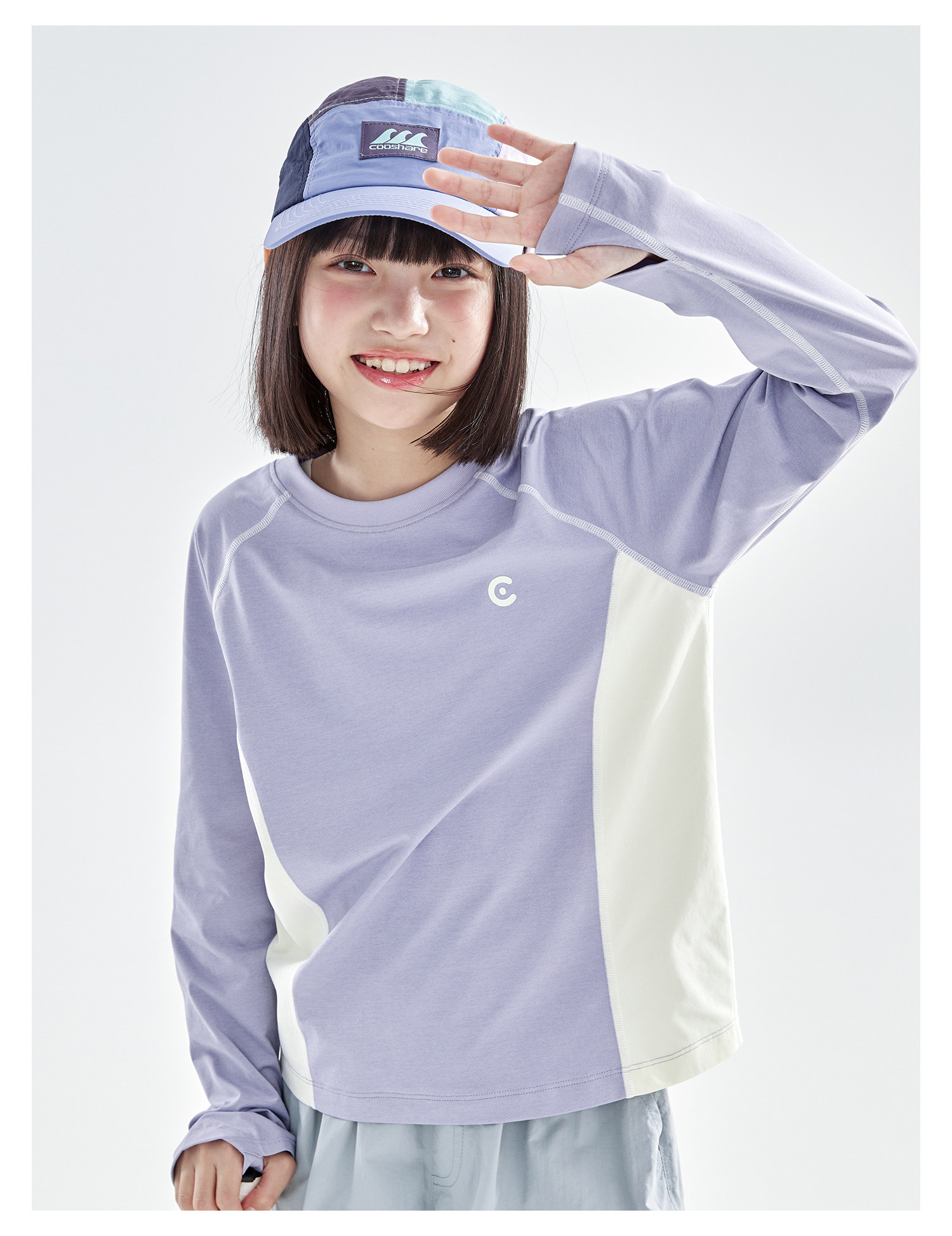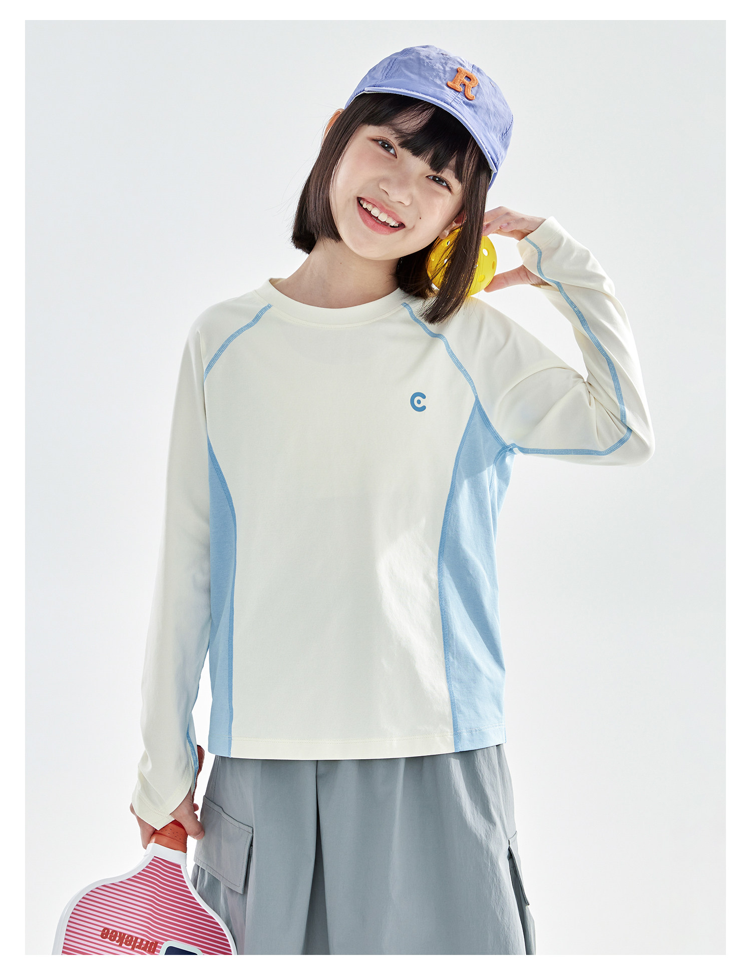 米白拼蓝预售4.7发 cicochild2026年春季新款女童棉感速干防晒T恤凉感7A抗菌拼色上衣