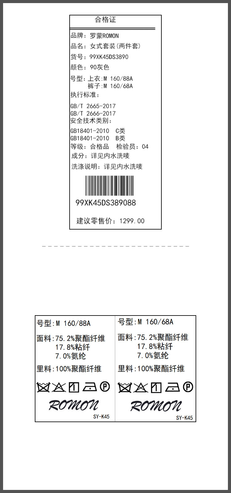 面料:75.2%聚酯纤维17.8%粘纤7.0%氨纶 里料:100%聚酯纤维