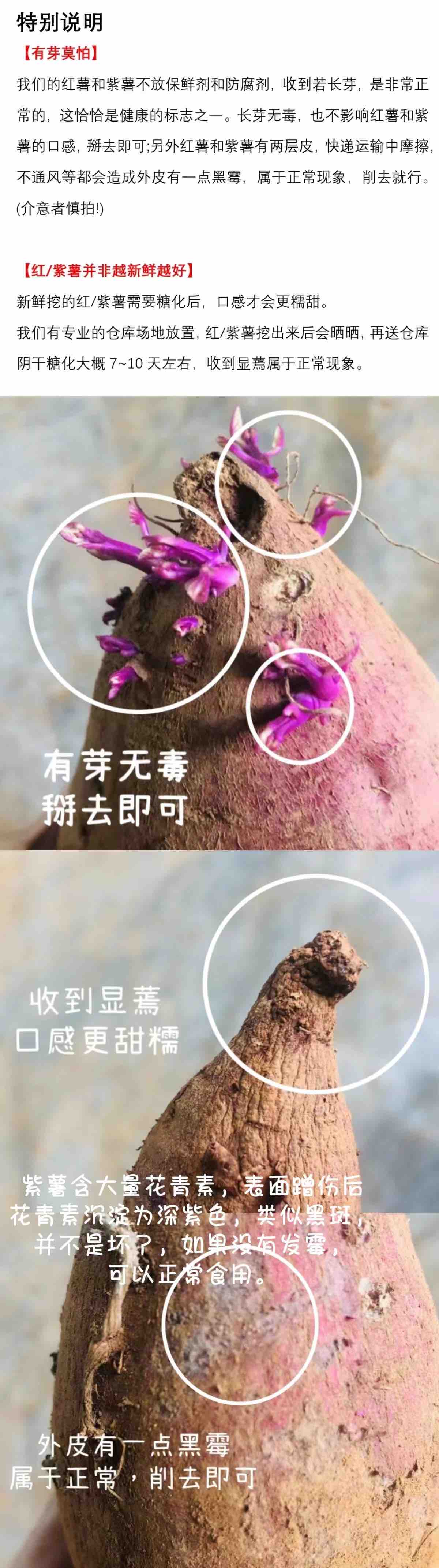 【关于售后】蜜糖紫薯属于生鲜产品,且较脆,细心呵护仍然在运输途中难免存在磕碰。如有个别断裂属于正常损耗,如果断裂情况较多,请联系客服,酌情按比例赔付;如有腐烂情况,请收到包裹12小时内,提供坏果和快递单,联系客服,闪电赔付,保证让你售前售后都满意。