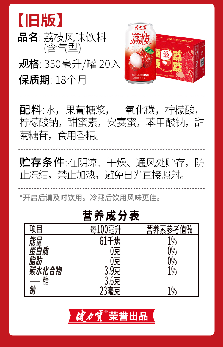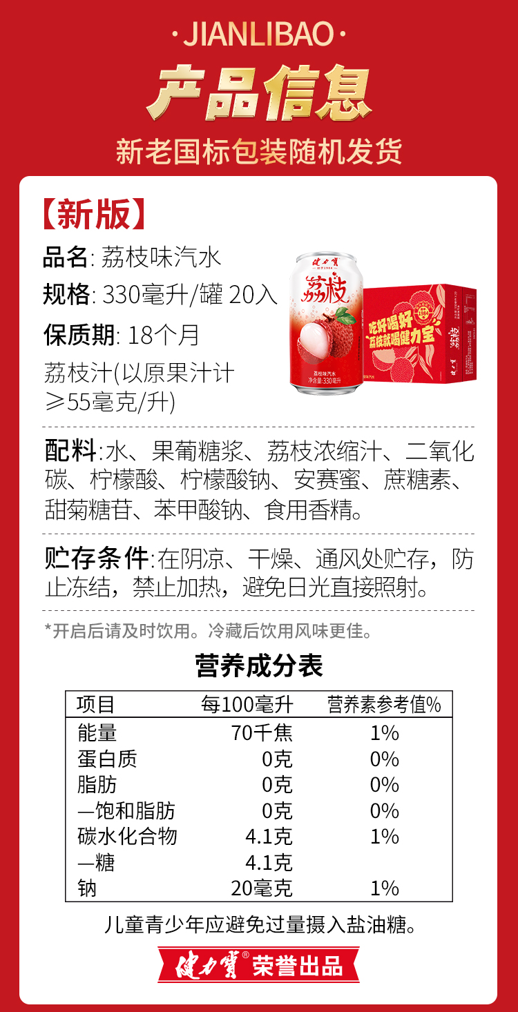 健力宝无糖苏打水汽水330ml*12罐整箱装 原味0糖气泡饮料