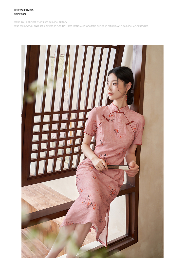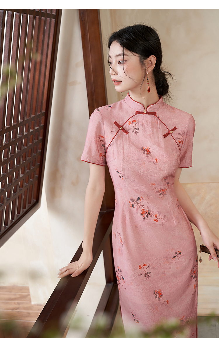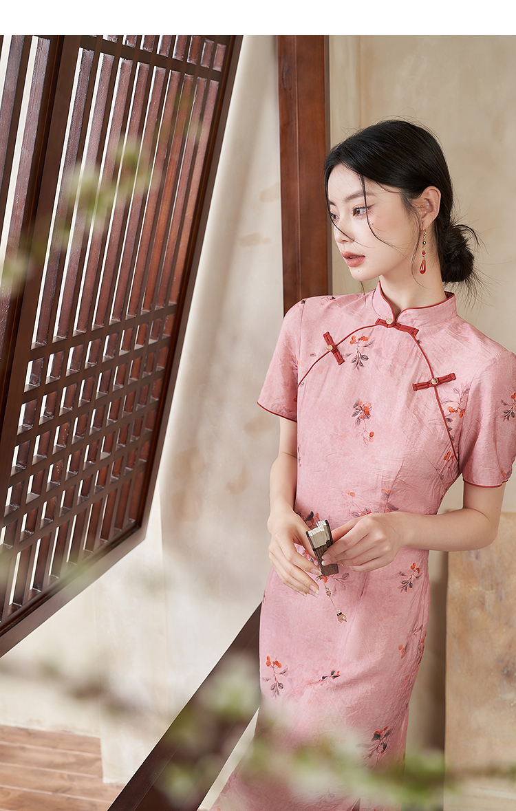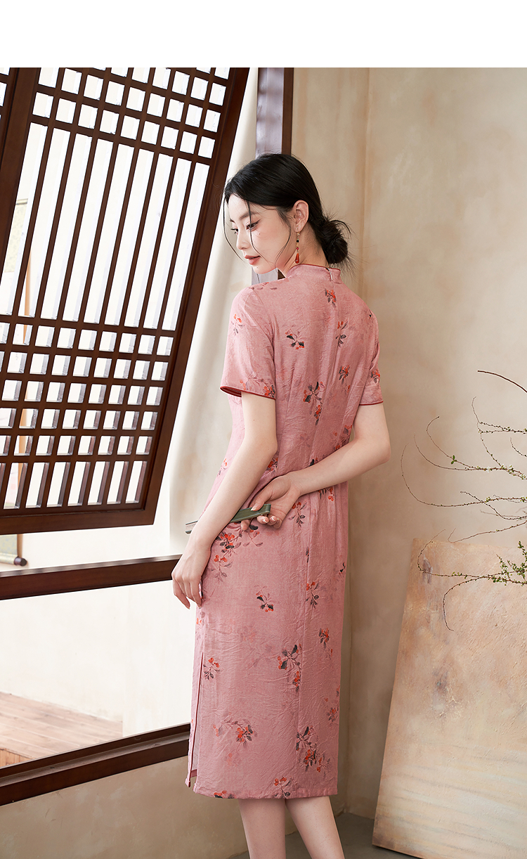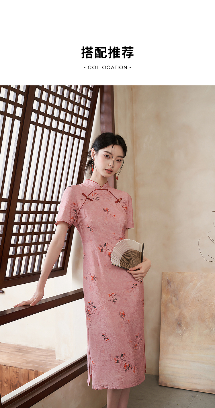 新中式国风花卉印花连衣裙夏季古典立领盘扣短袖改良旗袍V0050800