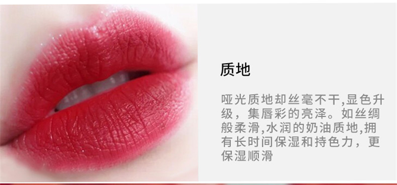 巨显白的哑光复古红!不愧是海报主推色,质地丝滑柔顺,持久度也很好,薄涂玫调会重一些,厚涂更深更红,