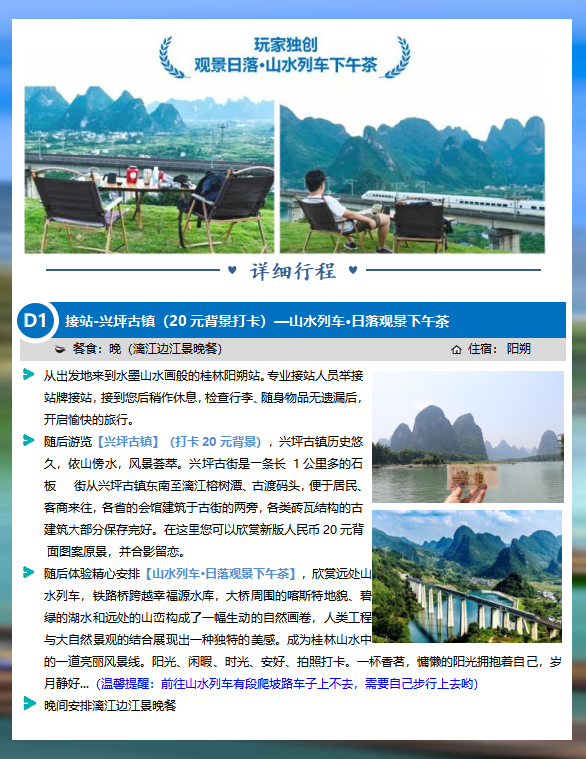 Day1:接站—兴坪古镇(20元背景打卡)—山水列车·日落观景下午茶