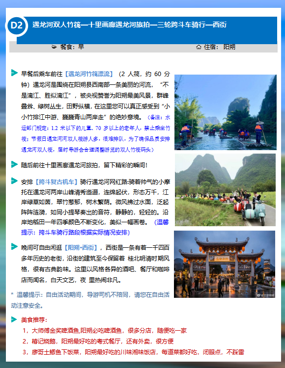 Day2:遇龙河双人竹筏—十里画廊遇龙河旅拍—三轮跨斗车骑行—西街