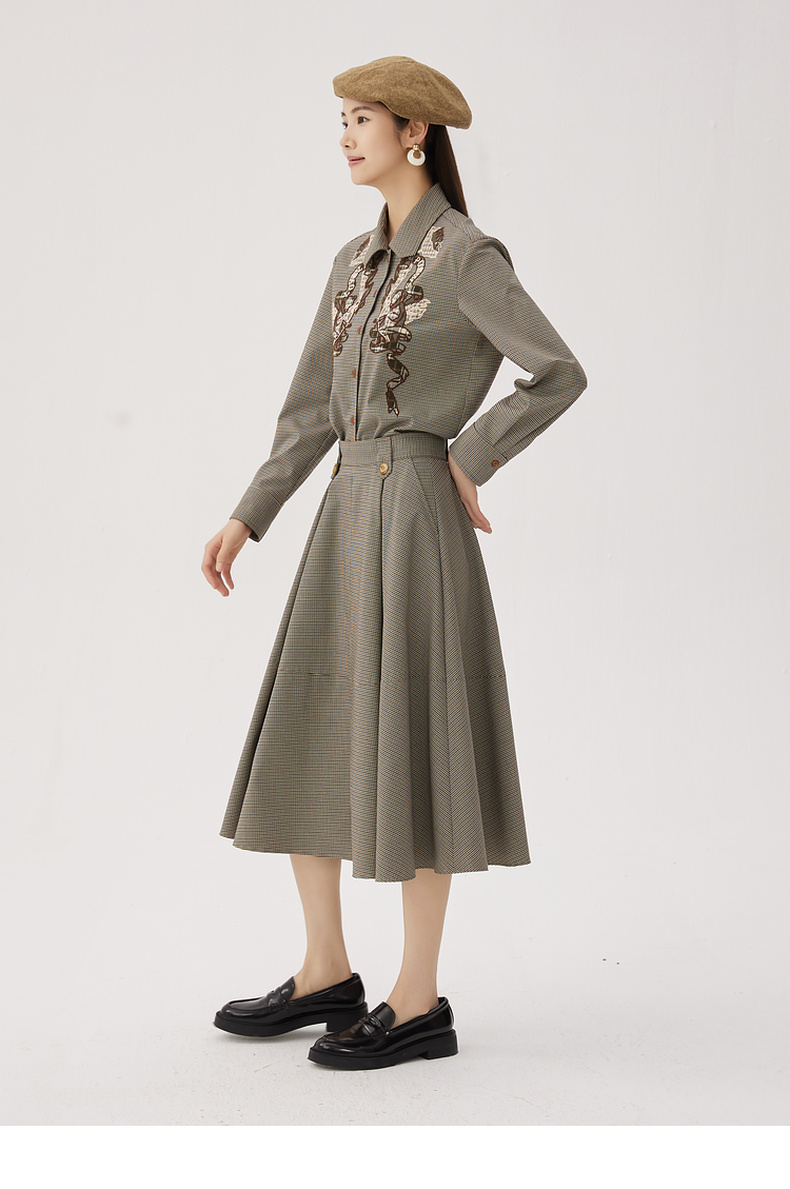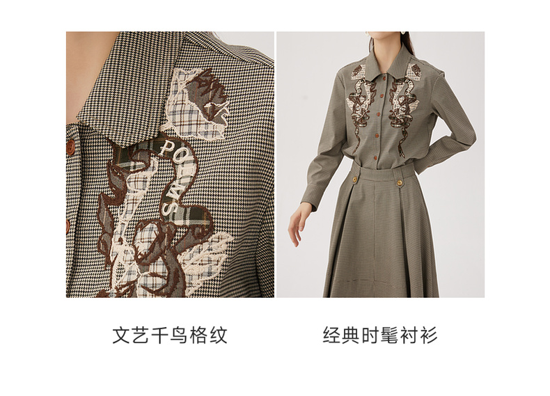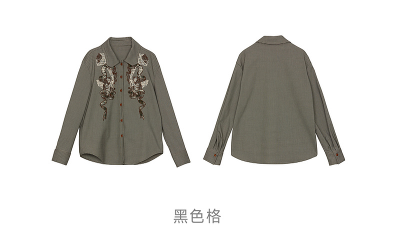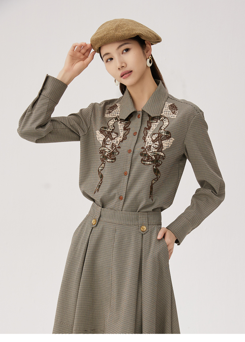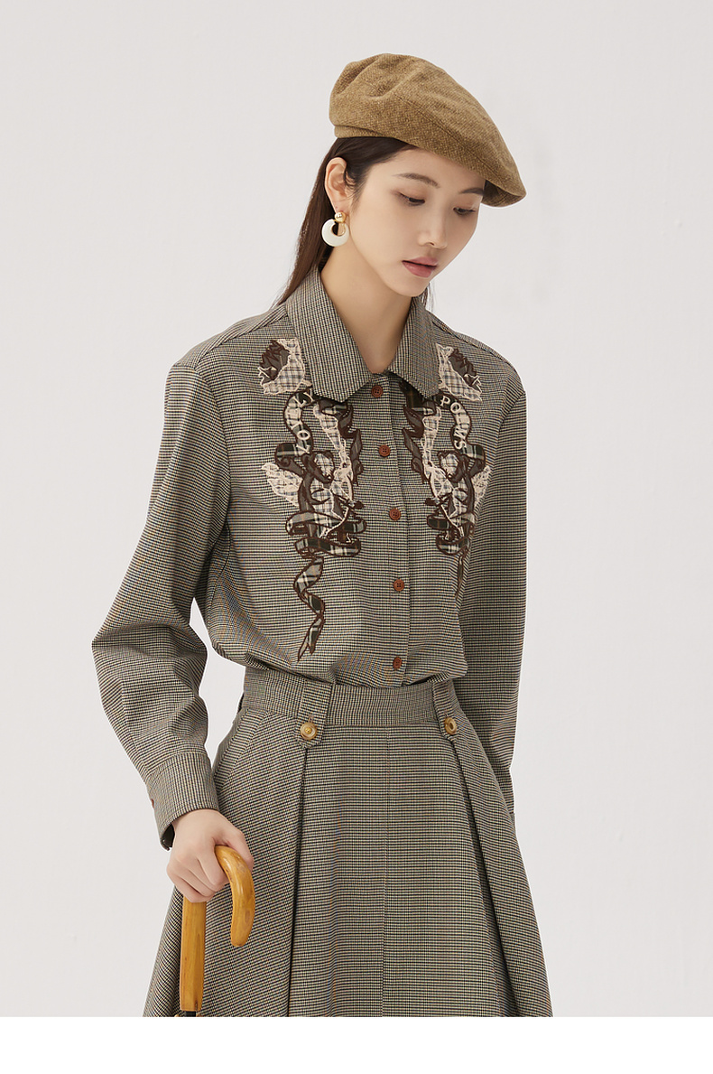 谜底千鸟格衬衫长袖女2024秋季新品复古风绣花H型衬衣243MC1165