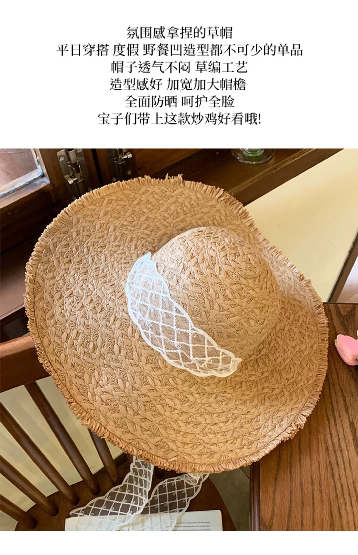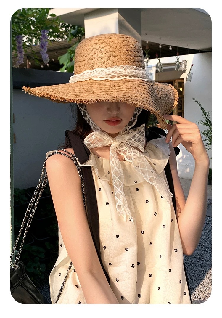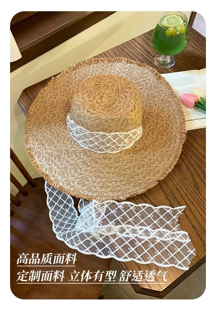 蕾丝系带编织草帽女夏季出游大帽檐防晒遮阳帽海边防紫外线沙滩帽 商品图7