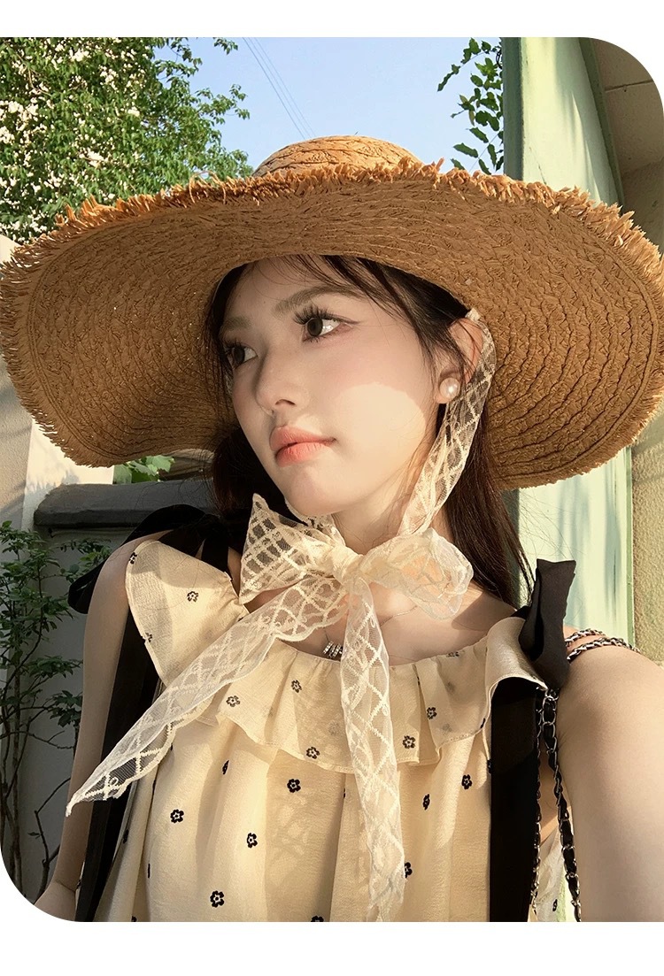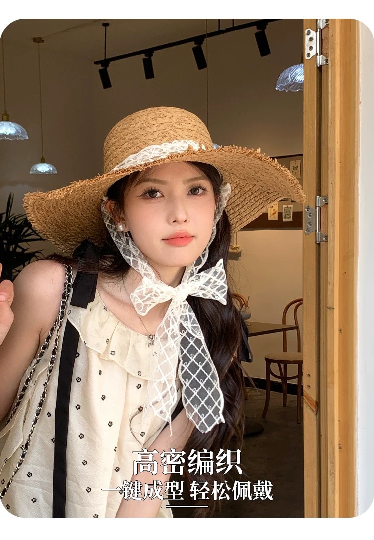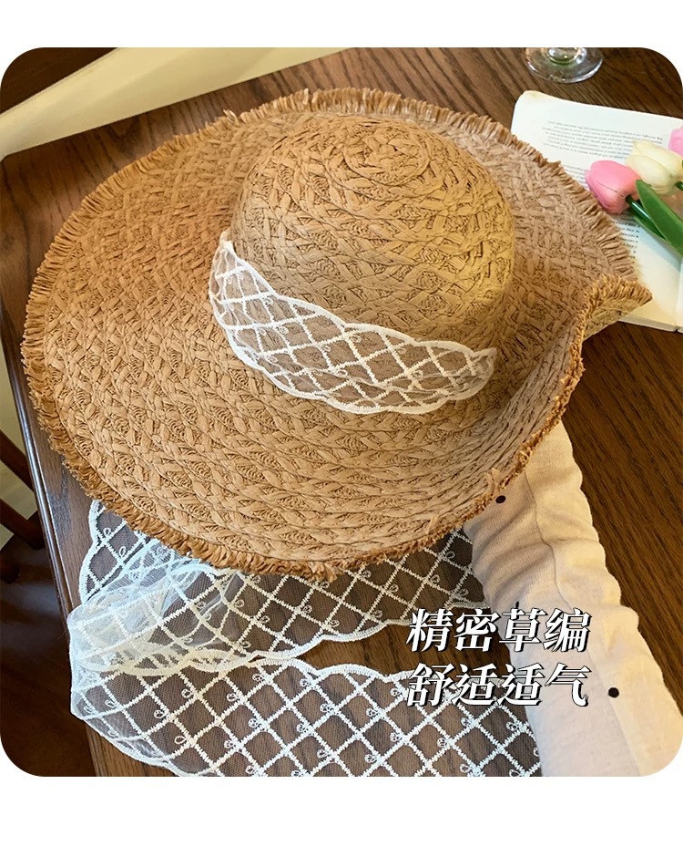 蕾丝系带编织草帽女夏季出游大帽檐防晒遮阳帽海边防紫外线沙滩帽 商品图1