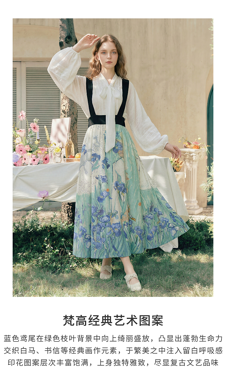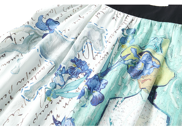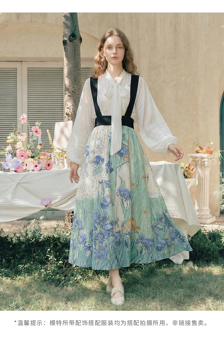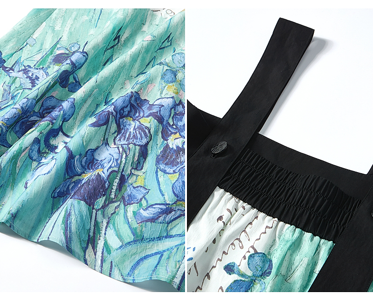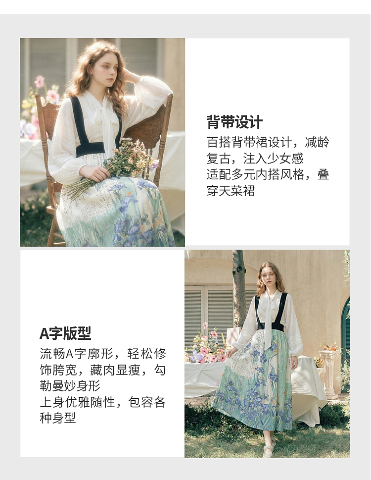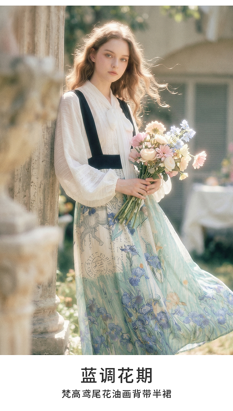 两三事梵高文艺 蓝调花期 2026夏季新款复古印花拼色背带裙半身裙