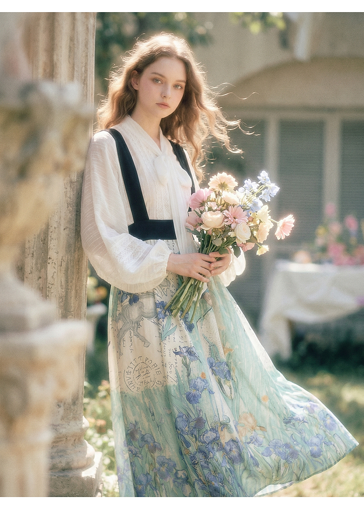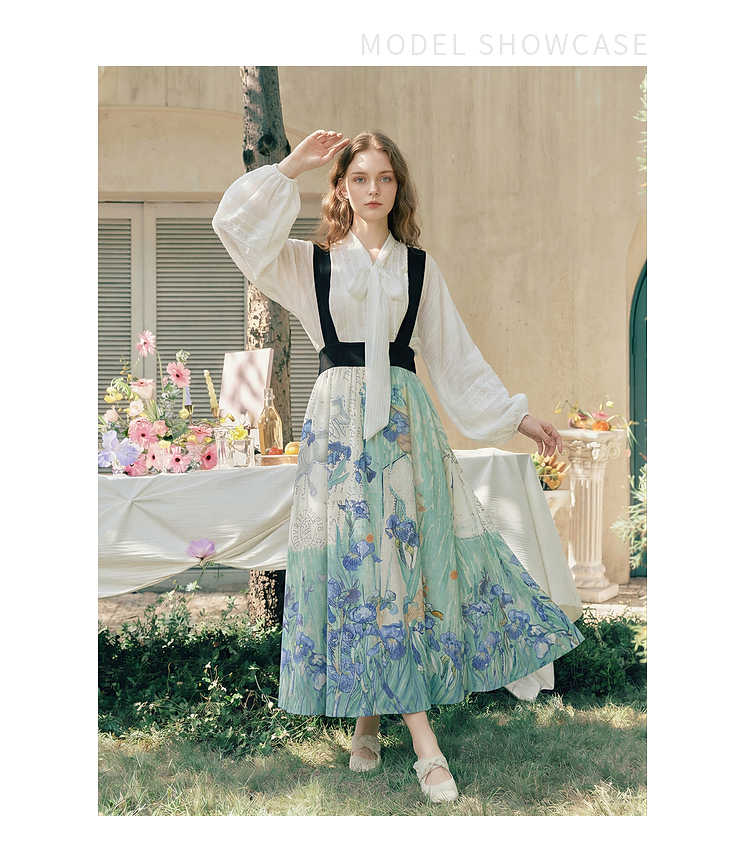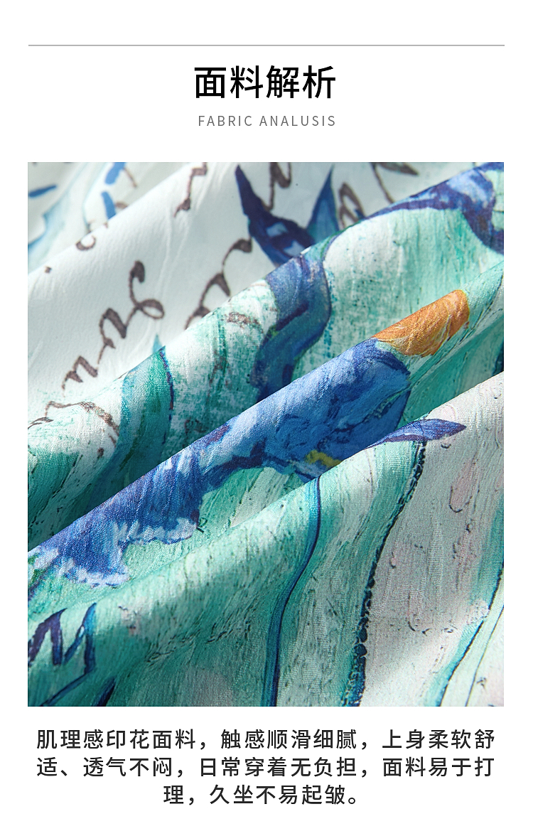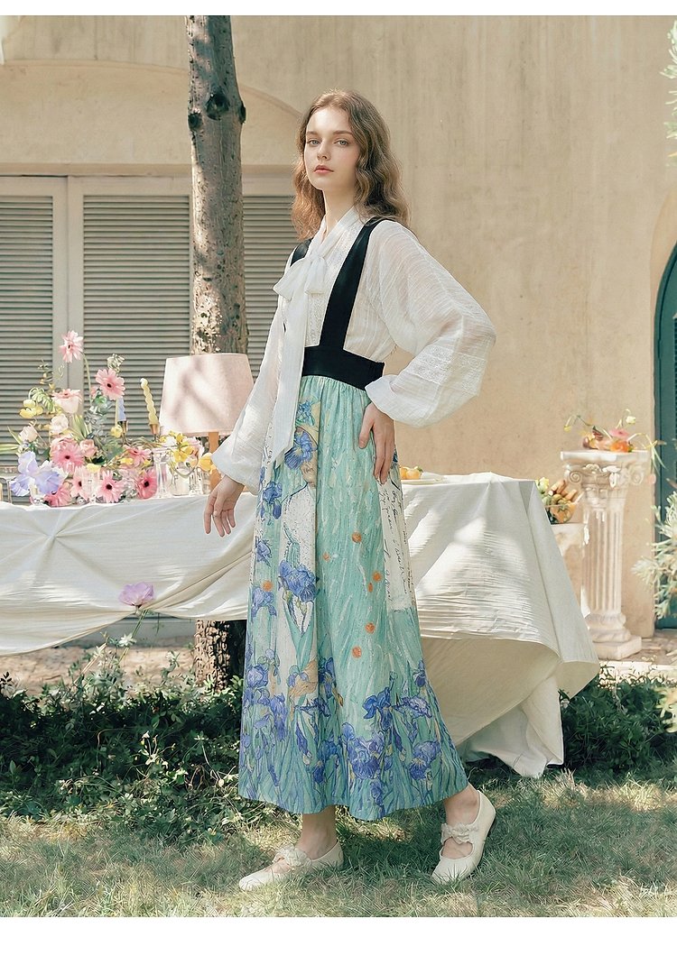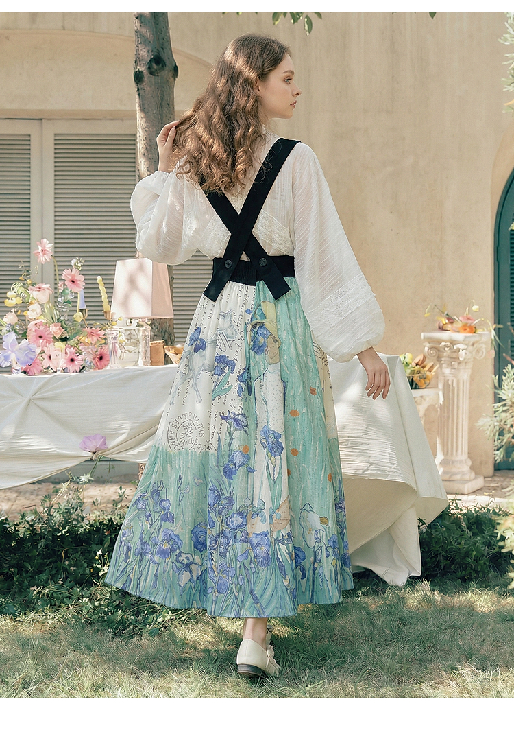 两三事梵高文艺 蓝调花期 2026夏季新款复古印花拼色背带裙半身裙