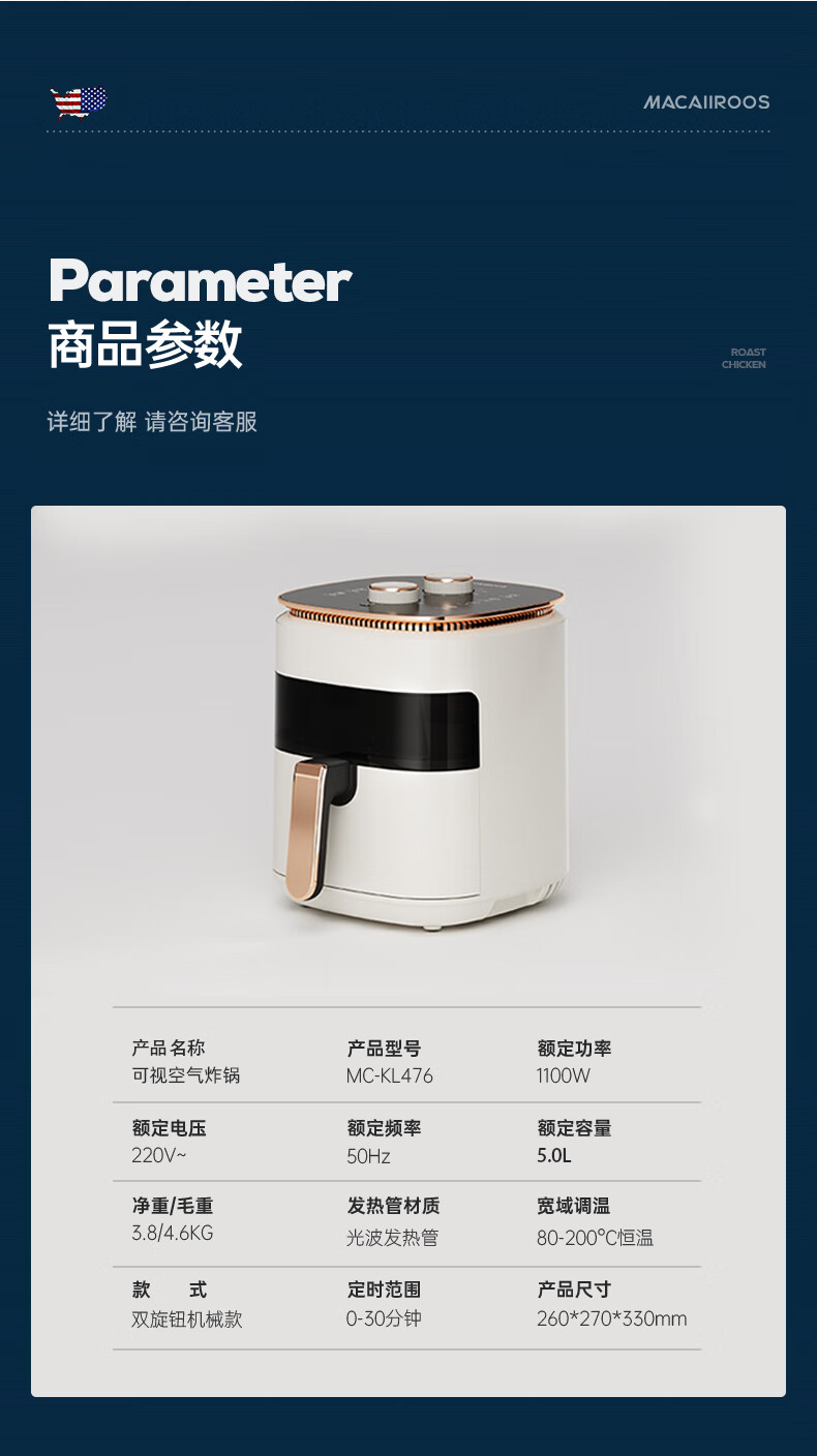 【小家电】迈卡罗MC-KL476空气炸锅 无油烟电炸锅家用多功能大功率 大容量 烤箱薯条机HF