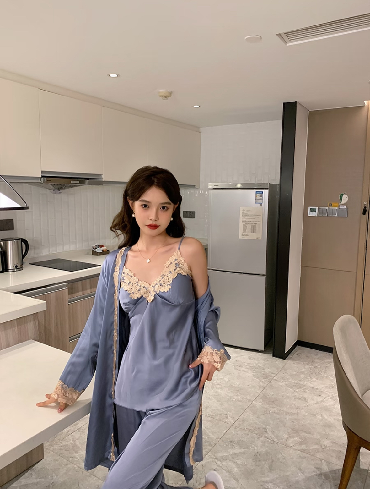 【伊页 冰丝五件套睡衣】睡袍+吊带睡裙+吊带背心+短裤+长裤 缎面冰感面料 丝滑垂顺 自带可拆卸胸罩