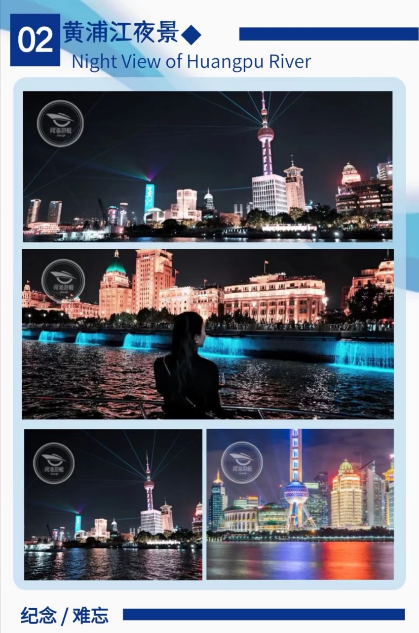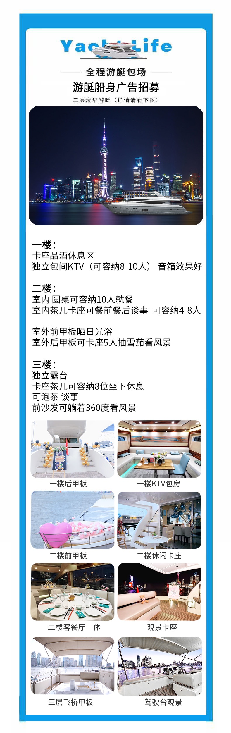 2小时航线:游艇码头—陆家嘴—东方明珠—杨浦大桥—掉头—外白渡桥—北外滩—外滩万国建筑群—十六铺—南浦大桥—梅塞德奔驰中心—掉头返回游艇码头