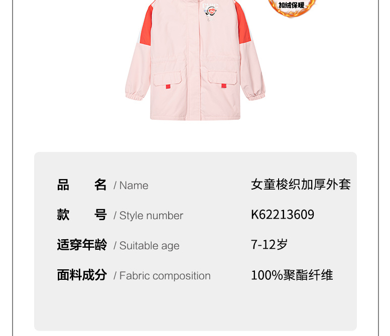 小361女童梭织加厚外套儿童加绒外衣防风2022春季新款K62213609