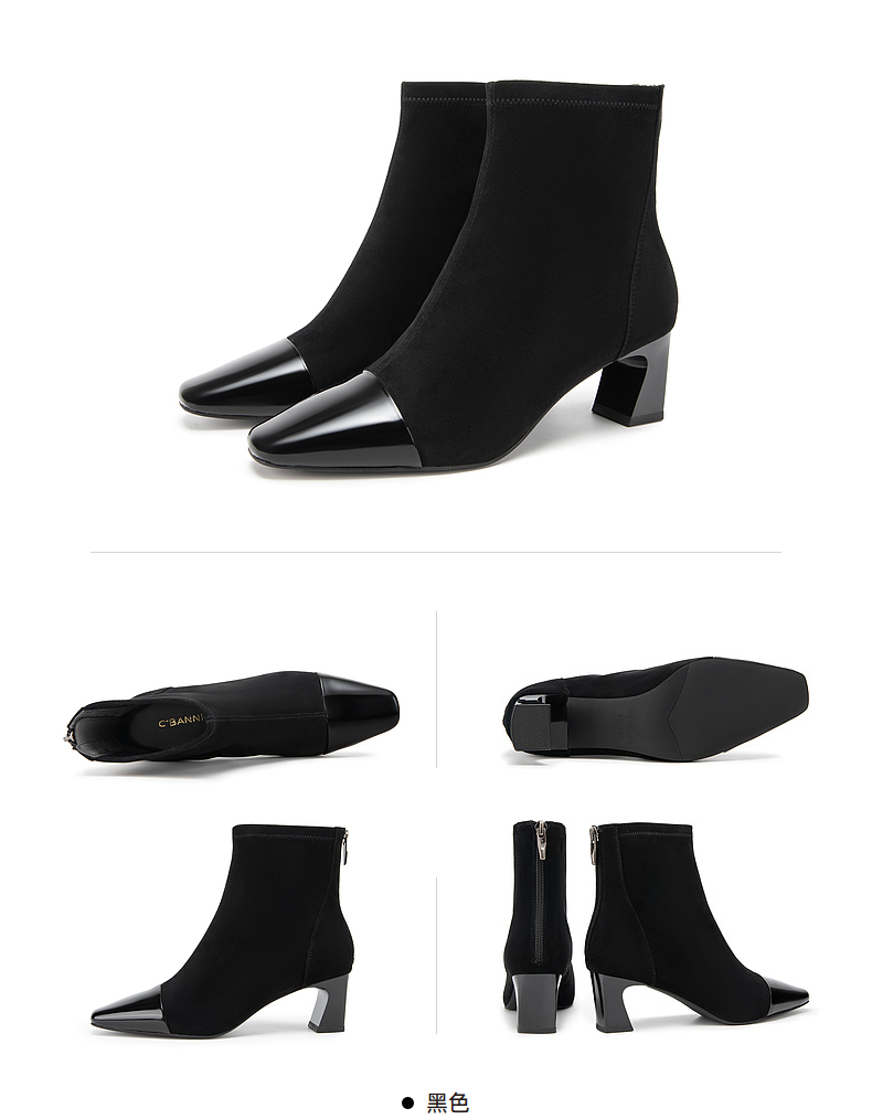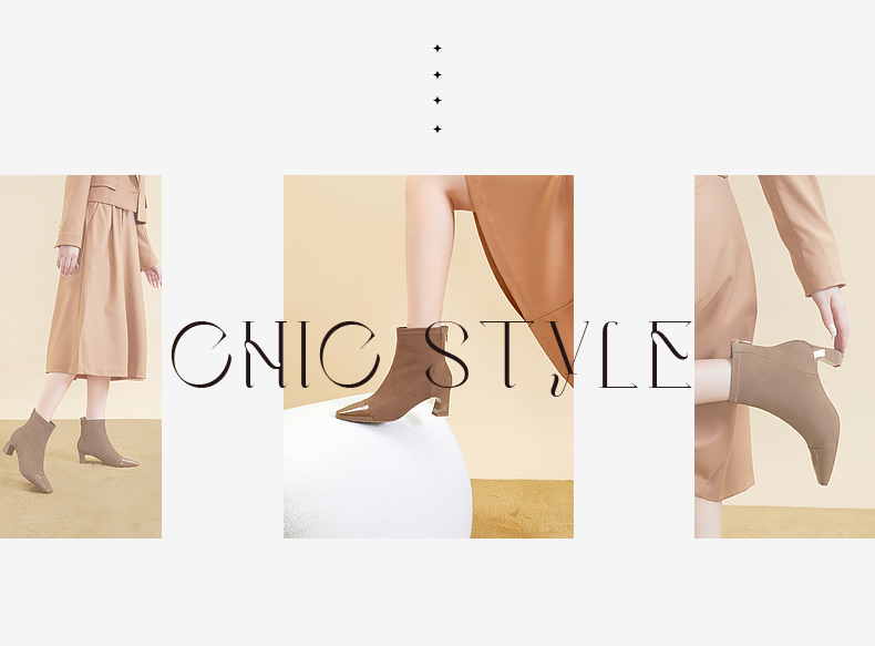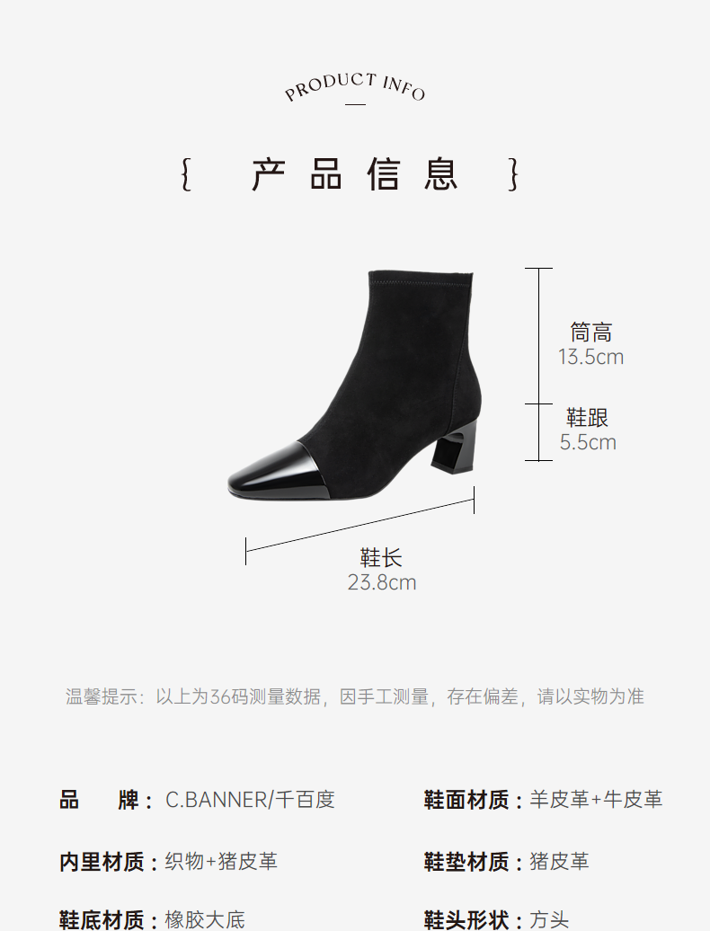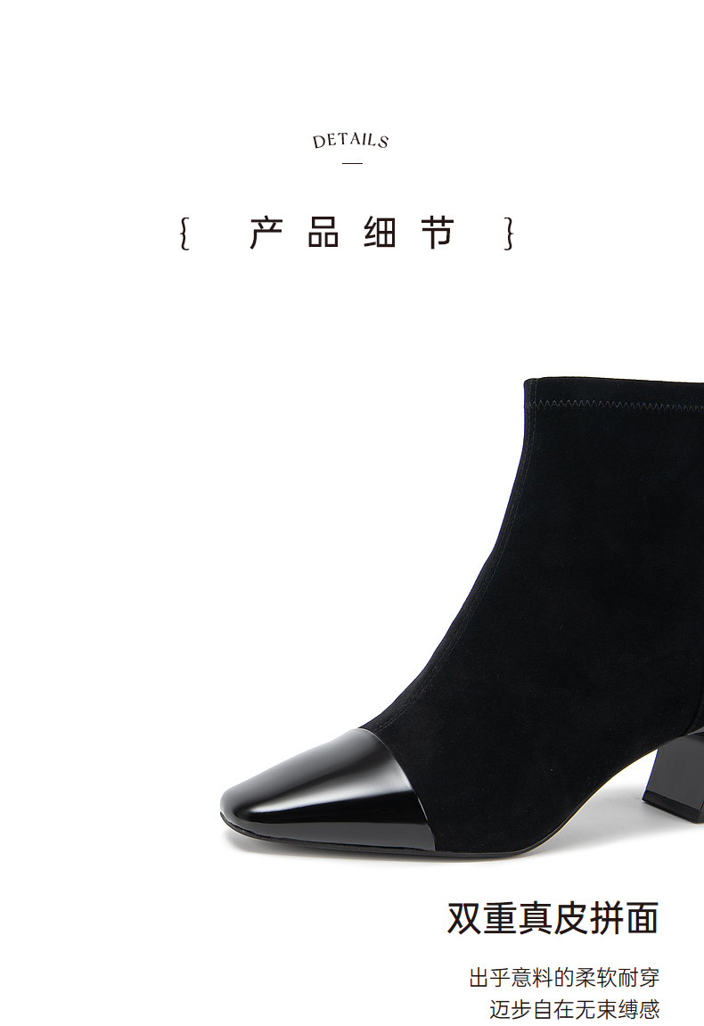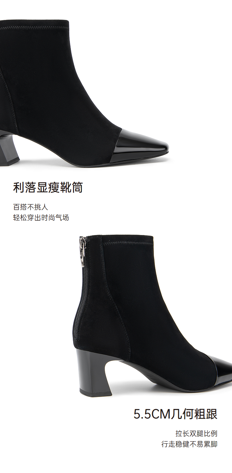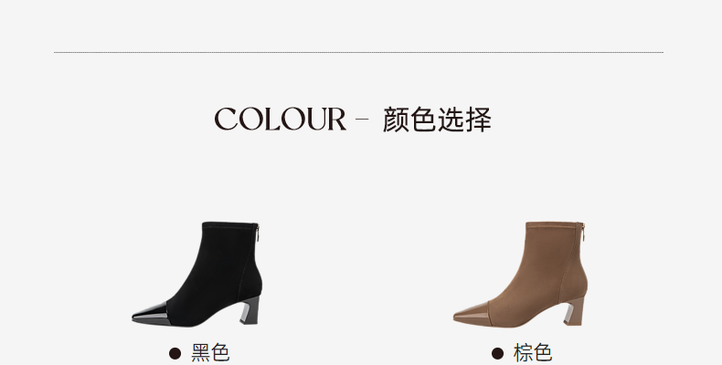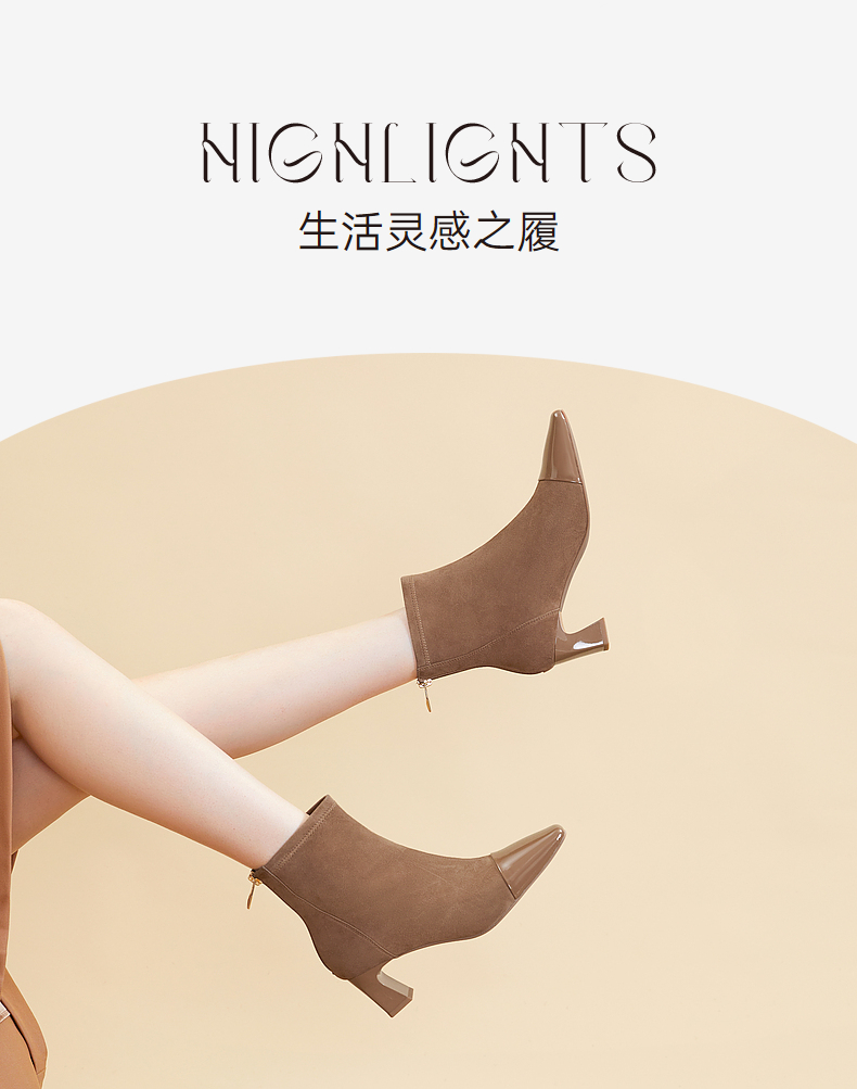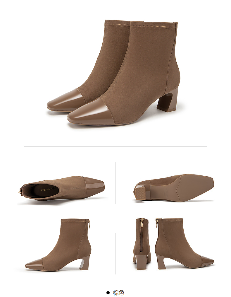 千百度百搭时装靴秋冬粗跟短靴女美拉德棕色高跟靴女鞋A23589721