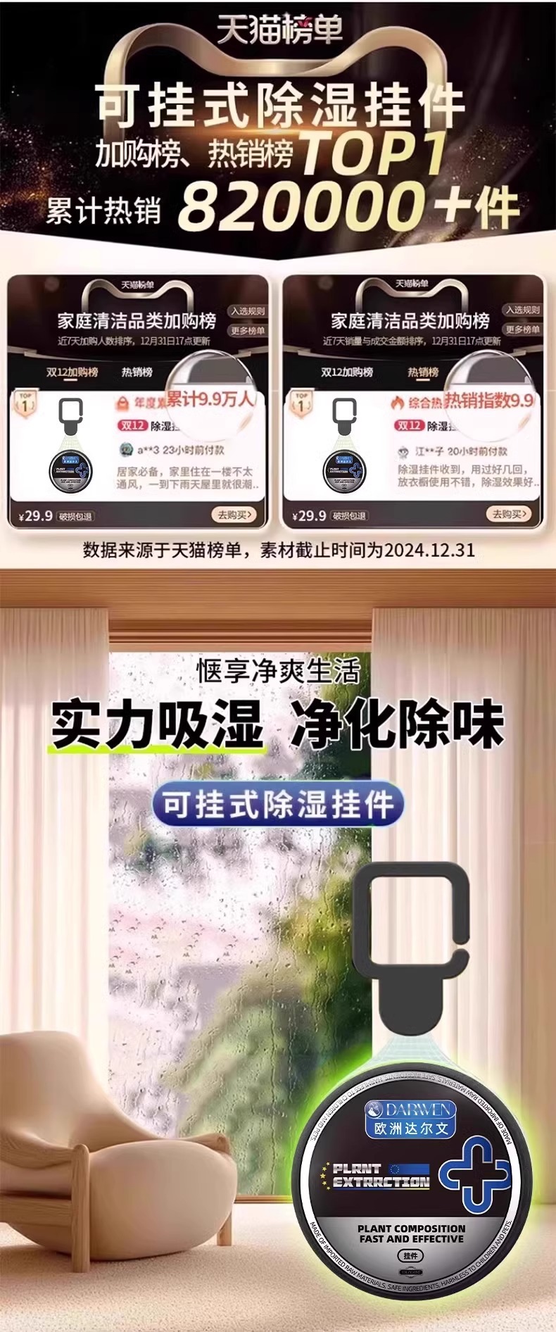 欧洲达尔文黑色挂件吸附湿气全天候清洁空气持久省心清除神器
