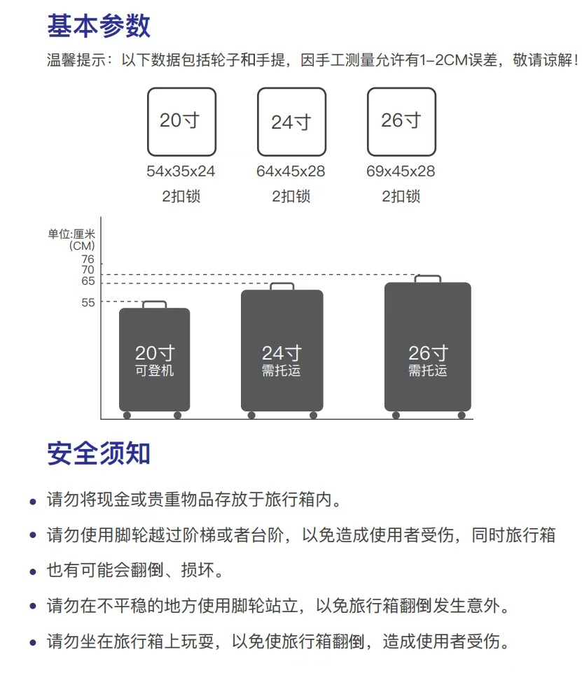 旅行箱为大件订单,请考虑好颜色尺寸在下单。下单后不撤单。拦截运费请自理。