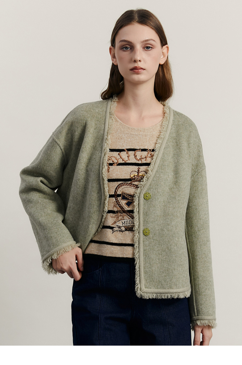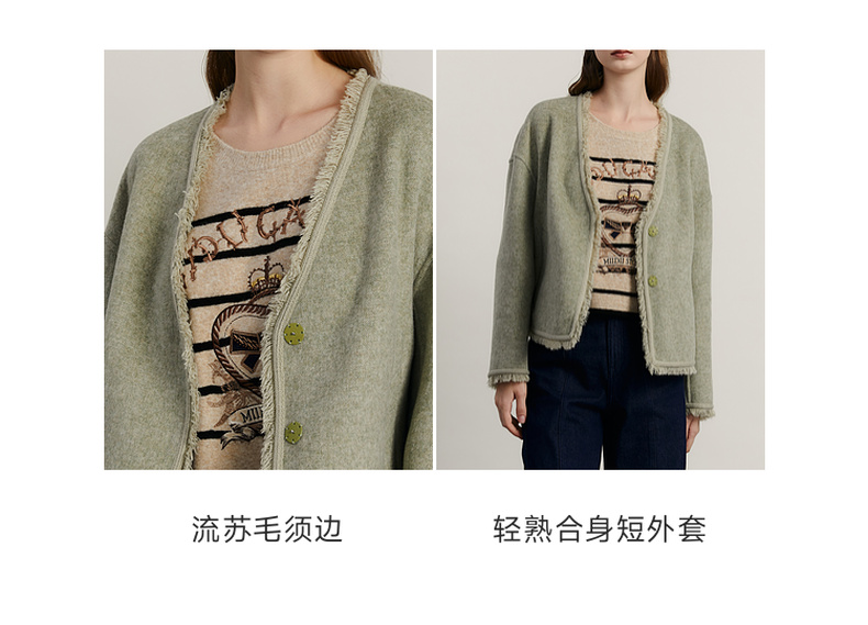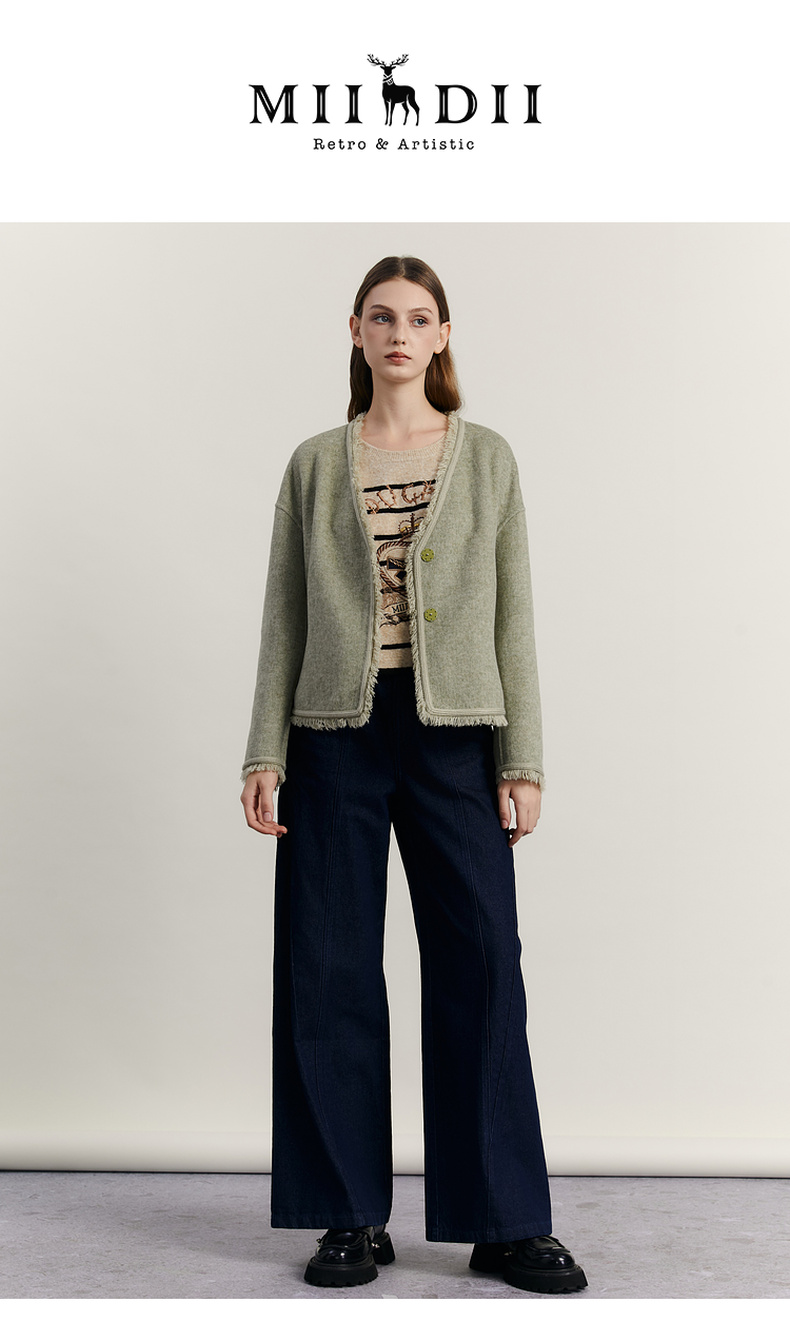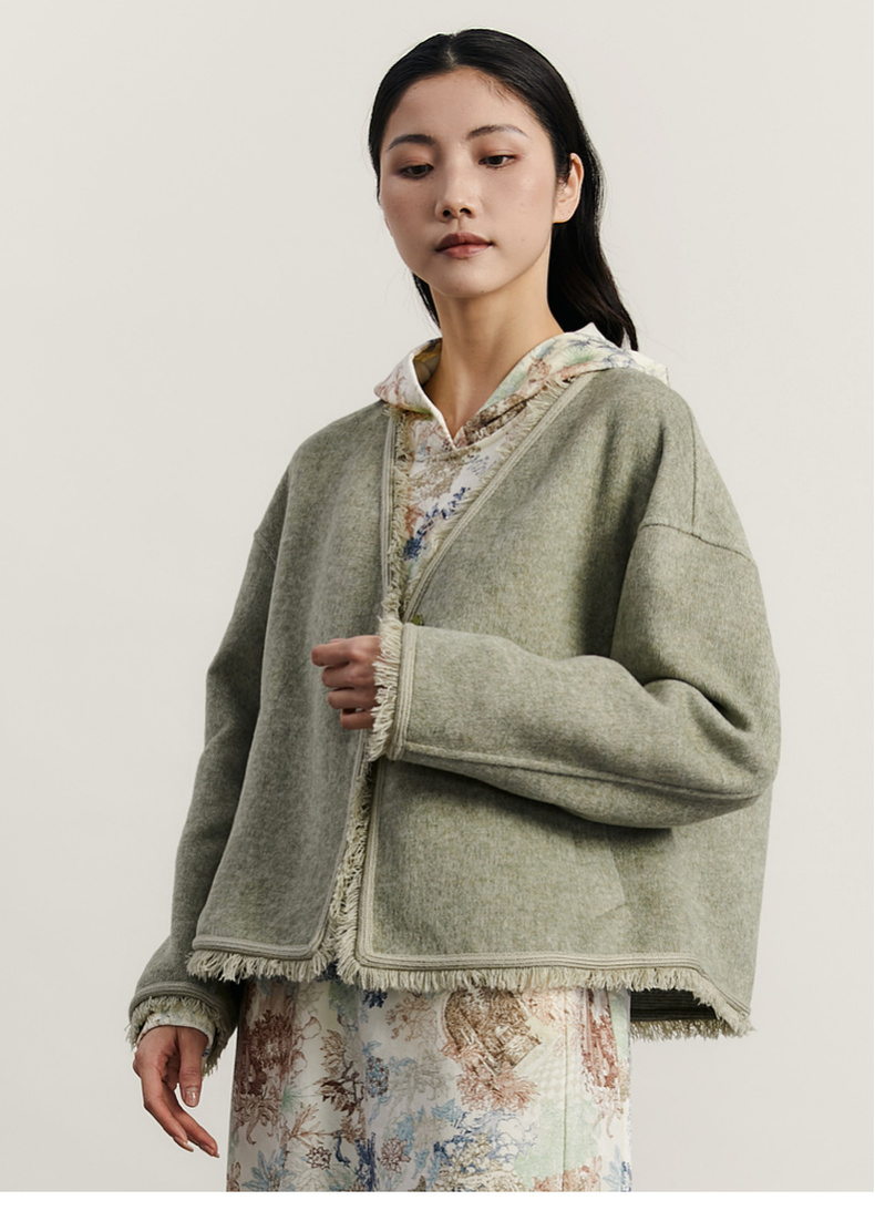 谜底短款毛呢外套女2023冬款复古文艺毛边宽松呢子大衣234MD1464