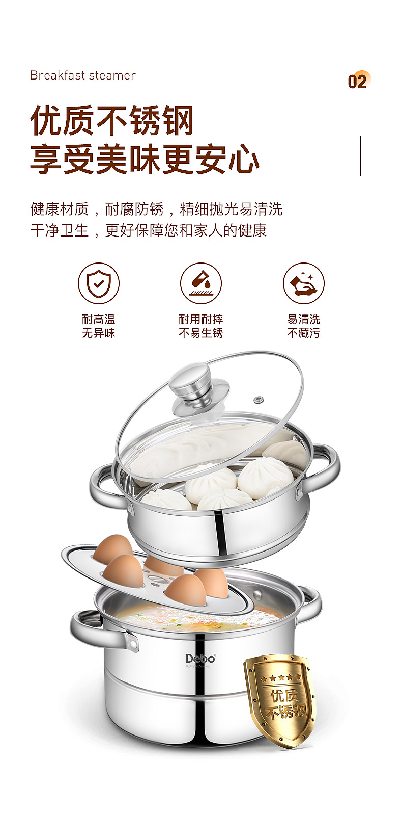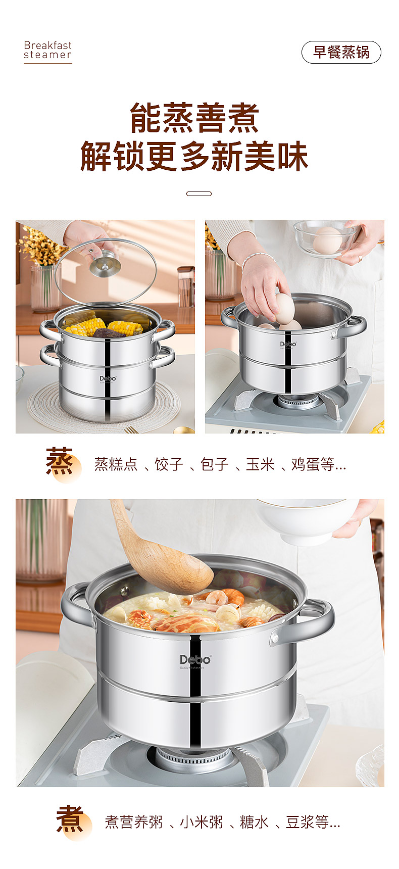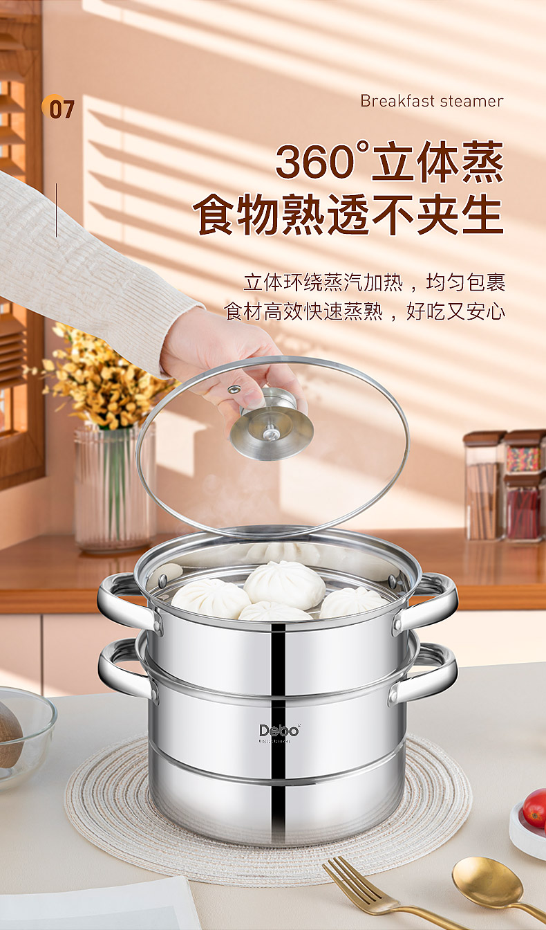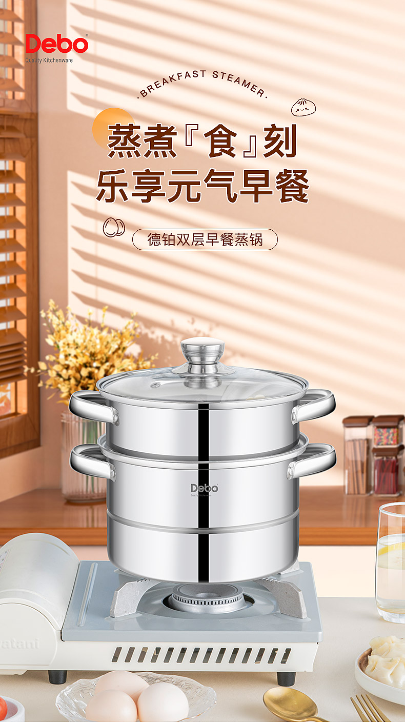 Debo德铂-科洛姆早餐蒸锅2.6L 小份量蒸煮 新鲜美味不浪费(配玻璃锅盖、蒸蛋架、蒸格)