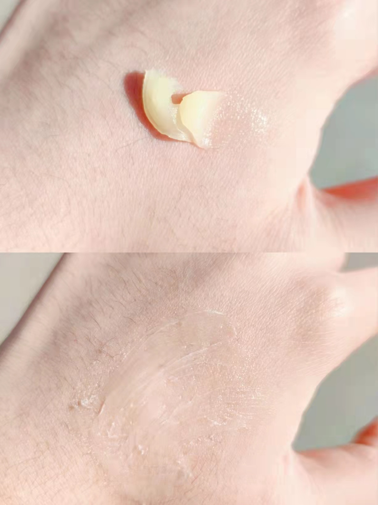 淡黄色膏体质地,涂抹开不会黏腻容易吸收