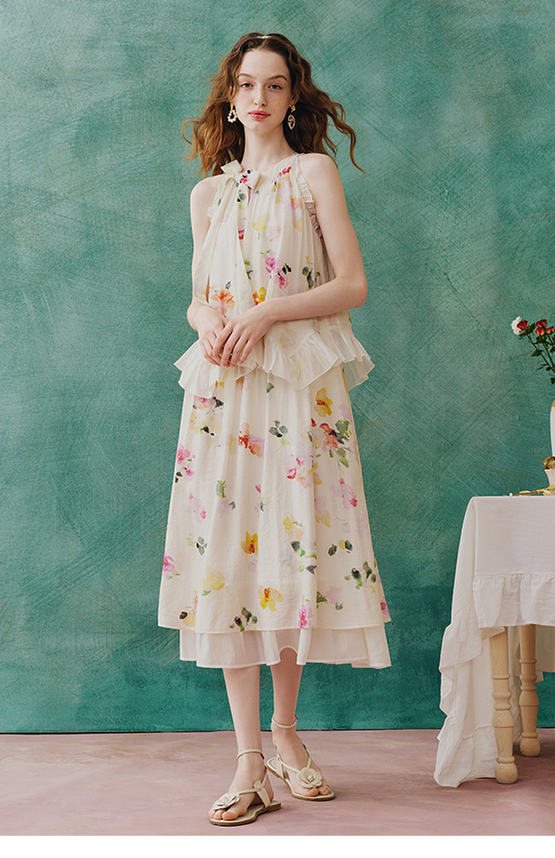 两三事 夏苑舞会 2025夏季新款荷叶边拼接绑带领印花背心裙连衣裙
