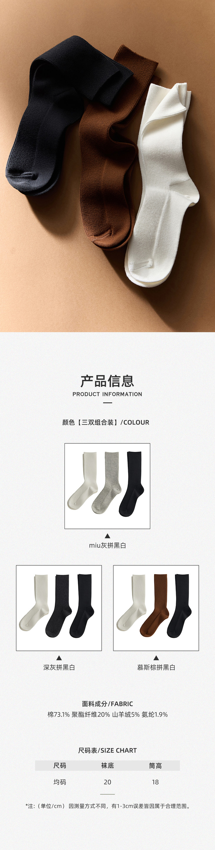 颜色(三双组合装):miu灰拼黑白 深灰拼黑白 慕斯棕拼黑白