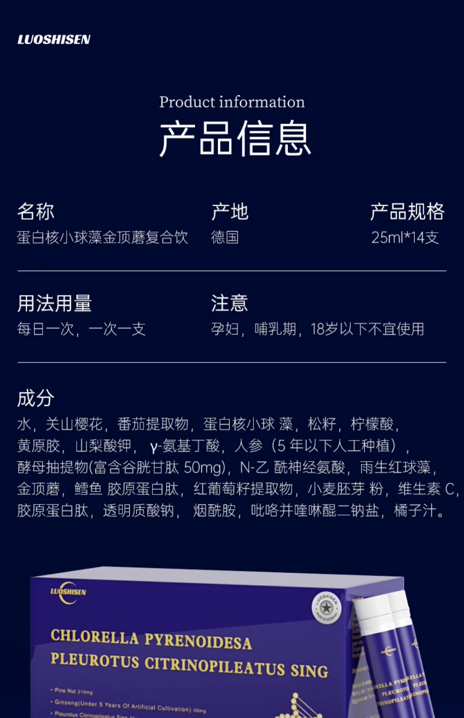 LUOSHISEN 洛仕森 蛋白核小球藻金顶蘑复合饮品 25ml*14支