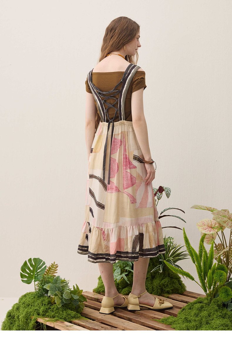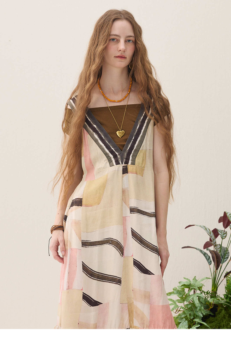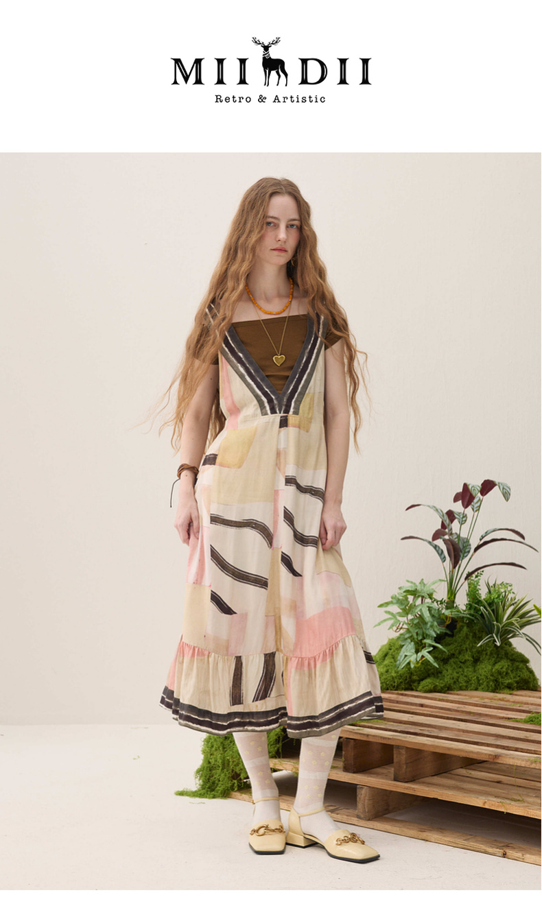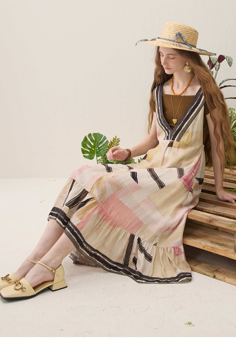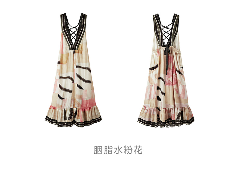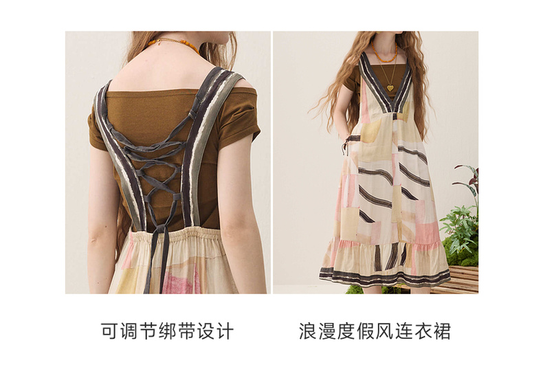 谜底印花连衣裙无袖2026春季新品绑带抽褶浪漫度假A型女261ML0064