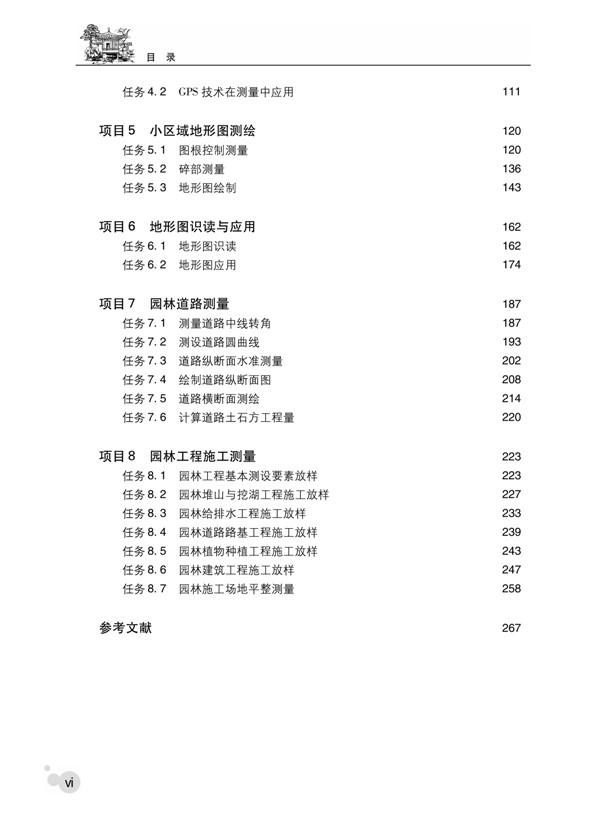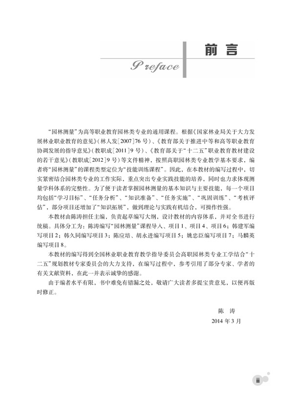 本教材根据园林类职业岗位群必须具备的测量知识与技能,按照“项目导向、任务驱动”的原则,在“园林测量”课程导入的引领下,共设计了基于工作过程的8个教学项目,分别为:水准仪度其高程测算、经纬仪厦其角度测算、距离测算与直线定向、电子全站仪与GPS应用、小区域地形图测绘、地形图识读与应用、园林道路测量和园林工程施工测量。8个项目共设置了32个任务,每个任务均以具体实例为栽体,并尽量采用图、表等形式将园林测量的基本知识与主要技能进行分解,力求做到深入浅出、言简意赅。