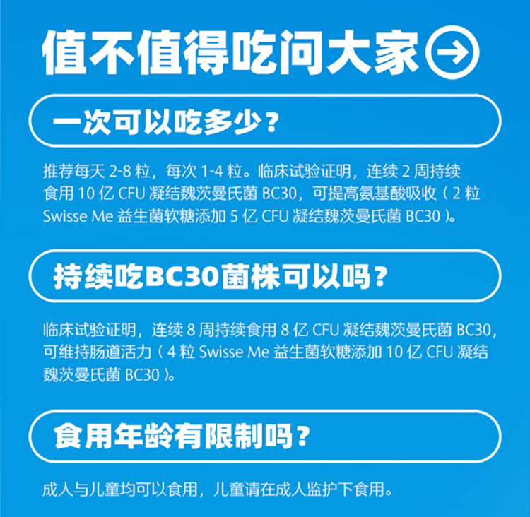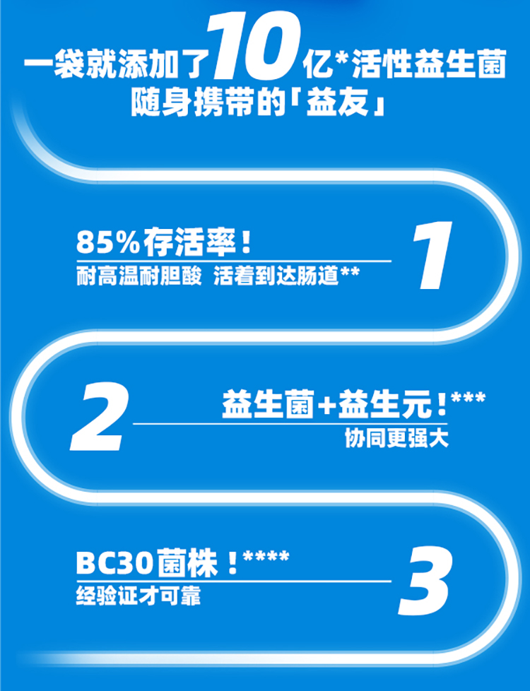 每包都含有10亿的BC30菌株+嗜酸乳杆菌