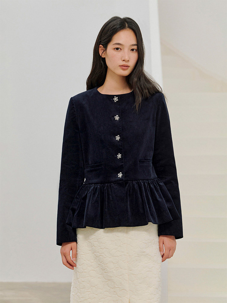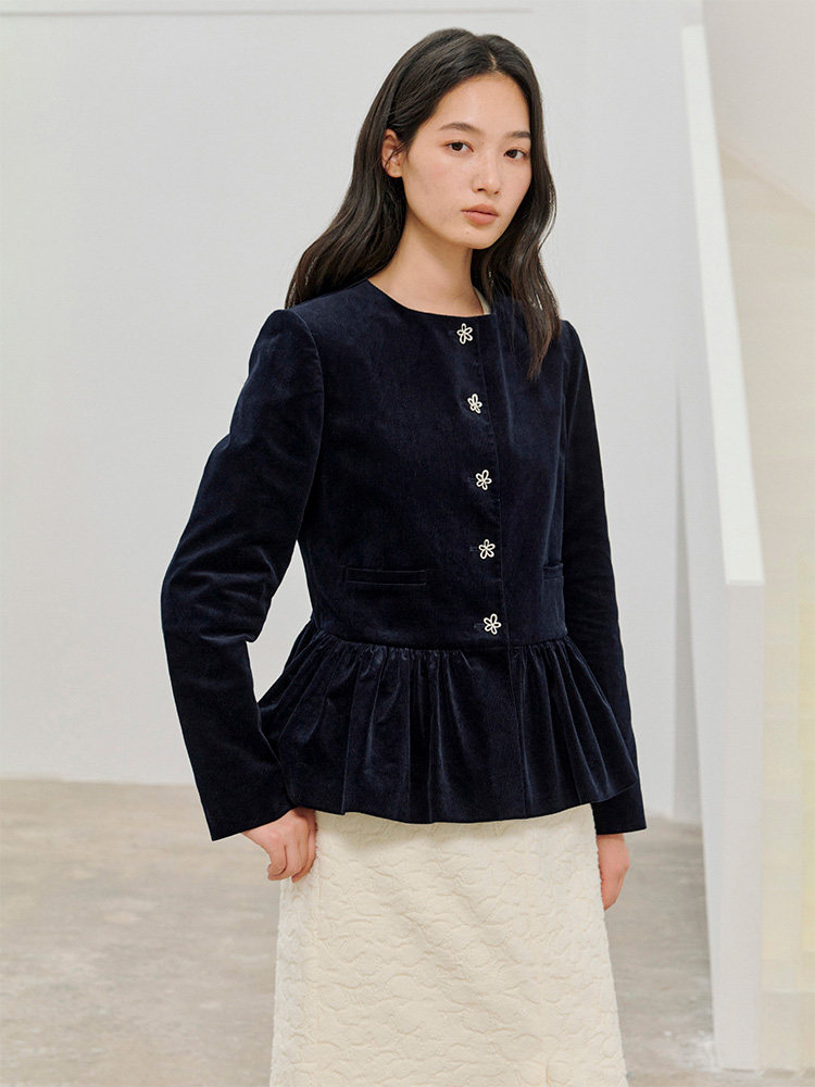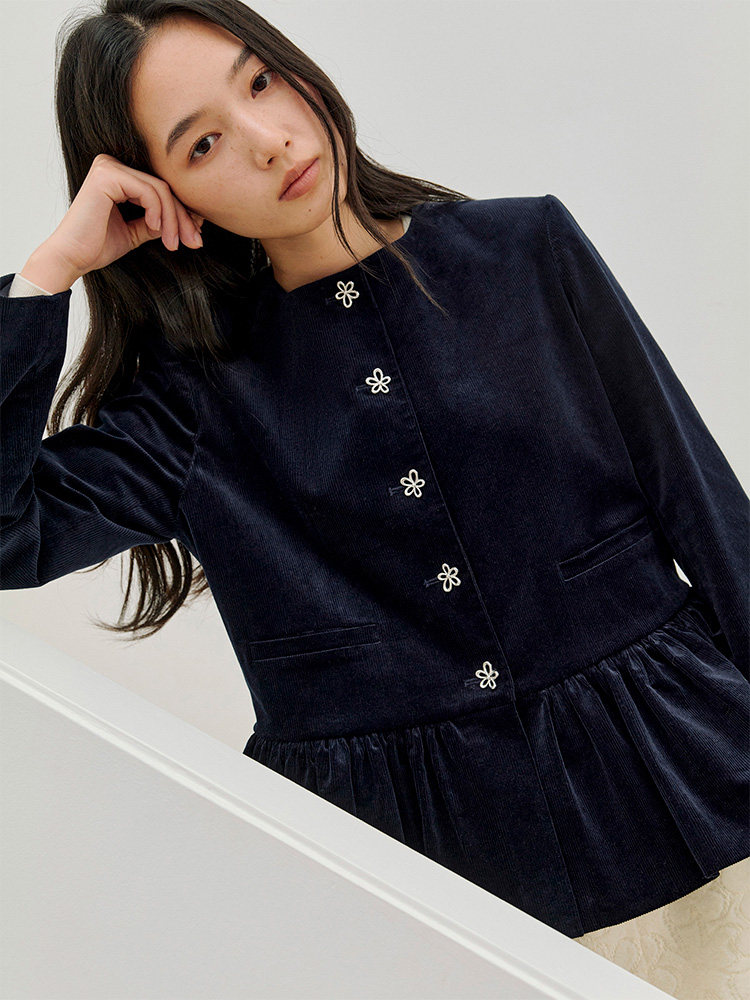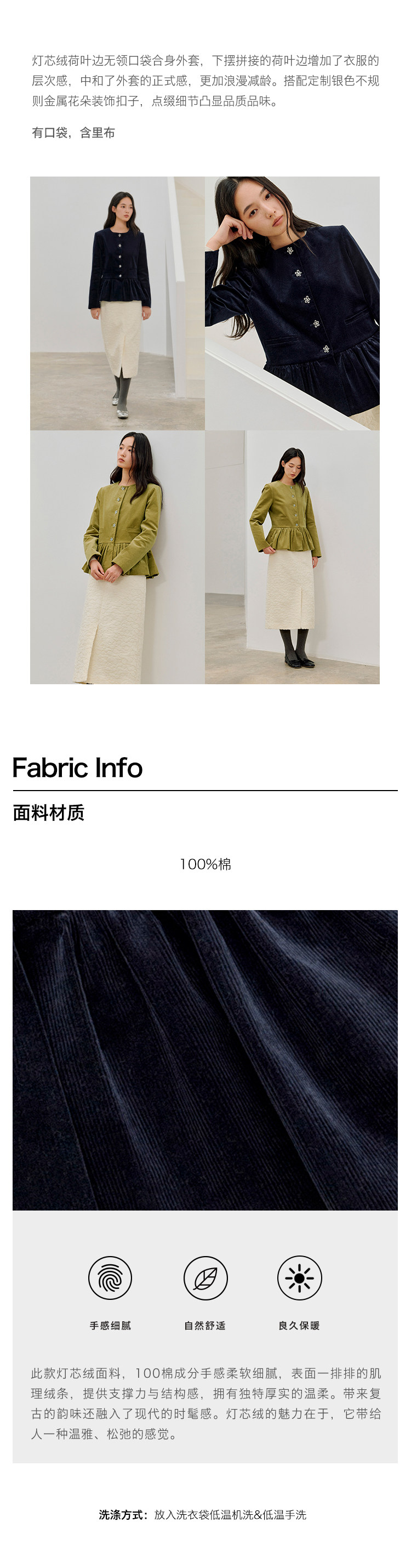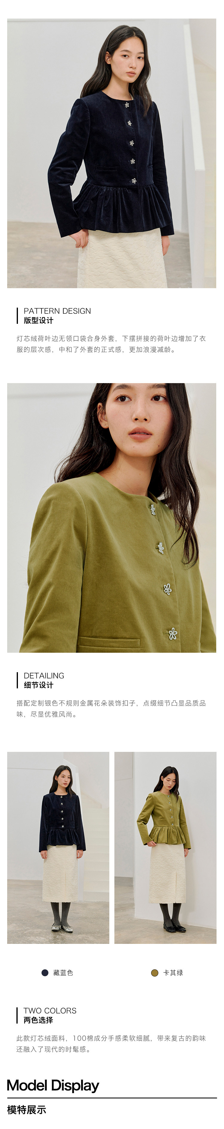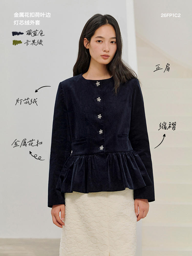 ForPoem 现货 26/SS原创设计感复古金属花扣荷叶边灯芯绒外套