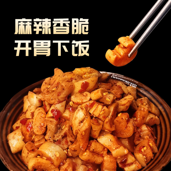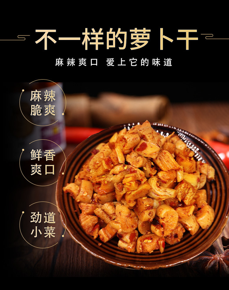 甄选当地优质白萝卜,鲜脆清甜,人工新鲜挖采😎 反复清洗后,自然晾晒风干成萝卜条 手工厚切之后再加入用心的调料配比 一口下去嘎嘣脆,口口脆嫩,健康美味,家中常备