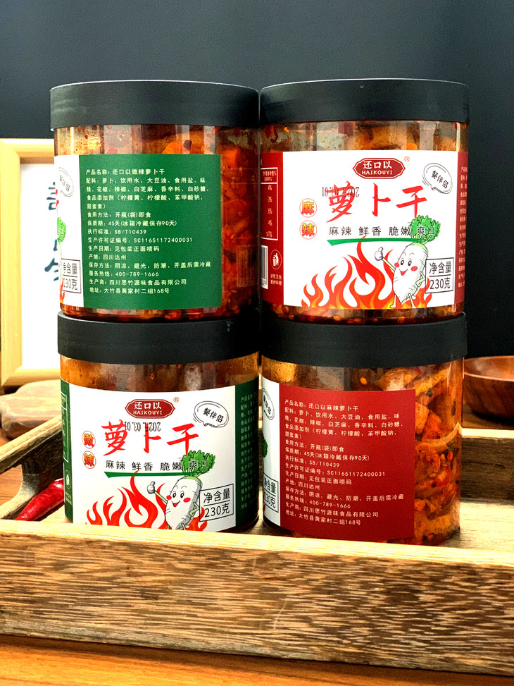 【产品名称】还口以麻辣萝卜干 【口 味】麻辣、微辣 【净 含 量】230g/罐 【保 质 期】45天(冰箱冷藏保存90天) 【发货地区】四川省达州市 【快 递】 随机发中通/申通/圆通/韵达/邮政,48小时内发货,内蒙古/海南/新疆/西藏/港澳台不发货,其他地区包邮 【关于售后】: 有质量问题请在签收24小时之内,带快递面单和产品质量问题的图片,报售后处理
